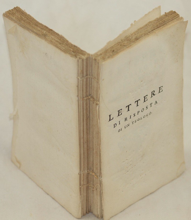 In 8. Dim. 19x12,5 cm. Pp. 15+(1)+319+(1). Rara opera del 1756 scritta da Don Biagio Stentucci prete di Toscana. L'opera si articola in una serie di lettere di risposta a ipotetici quesiti indirizzati a nobili, sacerdoti e varie persone su punti di morale e religione. Tra gli argomenti trattati: Rivelazioni divine, Probabilismo e Probabiliorismo, coloro che procurano voti per cariche lucrative o onorevoli, ad uno studioso di lettere ed arti che voleva studiare le scienze divine, Immortalità dell'anima, ad una nobile offesa in quanto il confessore le aveva negato l'assoluzione, Ad una Contessa che voleva conformarsi sul modo di vestire, ad un Confessore sul comportamento da tenere con persone che proteggevano malviventi, operato dei medici, Ad una Nobile che chiedeva se è peccato mortale andare per teatri, Ad un giovane costretto dai genitori a sposarsi ecc. Opera completa di tutte le pagine. In discrete condizioni. Copertina assente. Legatura in discrete condizioni con rotture. All'interno le pagine si presentano in buone condizioni con fioriture. Fori praticati con una penna fino alle prime 14 pagine. Piccola gora d'umidità all'angolo inferiore destro. Scarce work of 1756 written by Don Biagio Stentucci priest of Tuscany. The work is articulated in a series of letters of answers to hypothetical questions addressed to nobles, priests, and different people about issues of moral and religion. Between the issues treated: Divine revelations, Probabilism and Probabiliorism, to a scholar of letters and sarts who wants to study divine sciences, Immortality of soul, to a noble to which the confessor denied absolution, to a noblewoman who wanted to dress on fashion, to a confessor about the behaviour to mantain with people which protect criminals, behaviour of physicians,To a noblewoman asking if it is pity go to theatres, to a young man forced to marrry ecc. Work complete of all pages. In fair conditions. Carton is missing. Binding in fair conditions with cracks. Inside pages are in good conditions with foxings. Little holes made with a pen auntil the first 14 pages. Little humidity stain in the lower right corner.