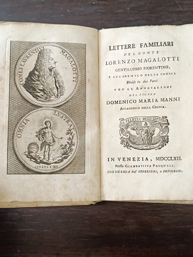 In-8° (cm. 18), cartonato coevo alla rustica con titolo anticamente manoscritto al dorso (leggermente stanca, lievi tracce d'uso), nome dell'autore in rosso al taglio inferiore; pp. XVI 680 in buono stato (lievi e sporadiche fioriture); con 1 medaglione allegorico recante il ritratto del Magalotti finemente inciso in rame all'antiporta fuori testo. Con marca silografica al frontespizio, capilettera e finalini sempre in silografia. Raccolta epistolare definita l'«Ateo Convito», cfr. Gamba 1977; Brunet III, 1292; Graesse IV, 335. Antica firma di possesso al contropiatto. Esemplare molto buono. (NH9)