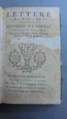 NAPOLI, ORSINO, 1788. Edizione prima Napoletana. Colla giunta di alcune lettere di diversi Uomini illustri al medesimo. In 16∞: pp. 237 + indice. Ritratto di Genovesi in rame all`antiporta. Frontesp. riparato ed anche la pagina 237 al margine bianco. Capolettera e finalini incisi. Bruniture per il tipo di carta. Leg. in mz. pelle con fregi in oro al d.