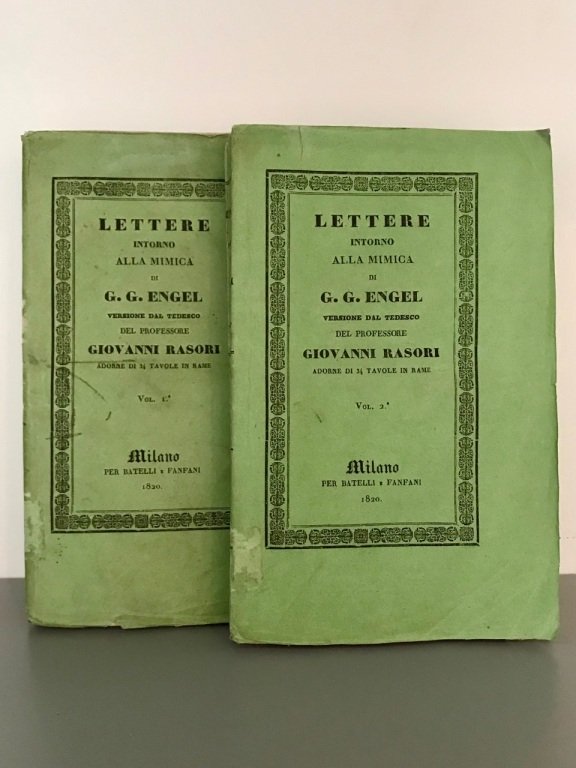 2 volumi in-8° (cm. 21,8), brossure editoriali a stampa verdi (piccola mancanza ad un angolo); pp. XXVIII 251 [1b], 239 [1] in ottimo stato, in barbe, con 60 espressioni di mimica incise in rame in 34 tavole fuori testo; leggero alone alle ultime carte del secondo volume. Dedicatoria a Luigi Porro Lambertenghi. Esemplare molto buono. (NG6-2c)