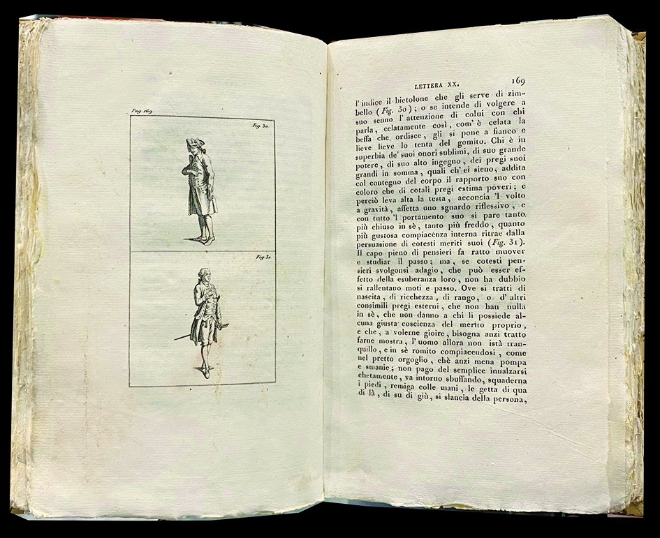 Aggiuntevi i capitoli sei sull’Arte della Rappresentatività di L. Riccoboni. Milano, Batelli e Fanfani, 1820. 2 voll. in 8° (cm 15 x 23) riuniti in un unico volume, legatura coeva m. perg. con tit. in oro al d.; pp. XXVIII + 251; 239 con 34 tavole fuori testo con figure incise all’acquaforte raff. posture mimiche. Prima edizione italiana della traduzione dell’opera di Engel, Ideen zu einer Mimik del 1785, un classico fra i manuali di istruzione per gli attori. Interessante l’aggiunta alla fine dell’Appendice “Dell’arte rappresentativa dell’attore” Luigi Riccoboni.