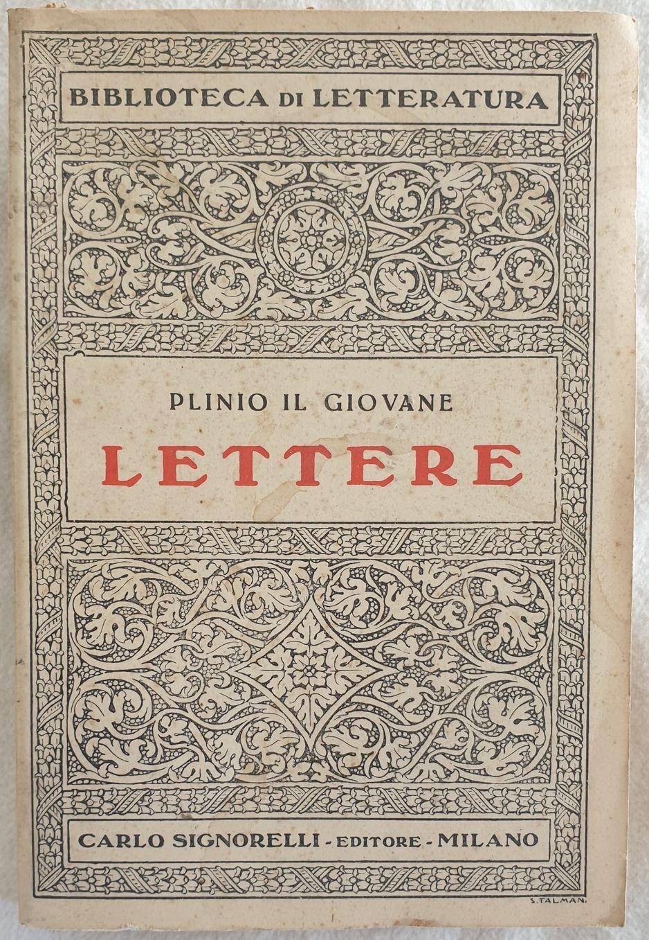 Edizione Signorelli del 1953 della collana "Biblioteca di letteratura" dell'opera classica "Lettere" di Plinio il Giovane. Traduzione e introduzione di Umberto Moricca. L'opera è completa. Graziose brossure con decorazioni. In ottime condizioni. Copertina editoriale in buone condizioni con lievi usure ai margini e dorso. Legatura in buone condizioni. All'interno le pagine si presentano in ottime condizioni con fioriture. In 16. Dim. 15,5x10,5 cm. Pp. 180Signorelli edition of the series "Biblioteca di letteratura" of the classic work "Lettere" by Plinio il Giovane. Translation and introduction by Umberto Moricca. The work is complete. Nice decorations on the covers. In very good conditions. Editorial cover in good conditions lightly worn in the extremities. Binding in good conditions. Inside pages are in very good conditions with foxing. In 16. Dim. 15,5x10,5 cm. Pp. 180.
