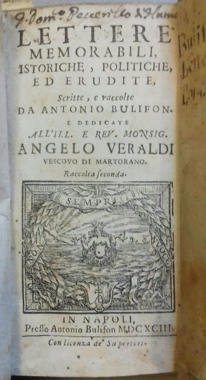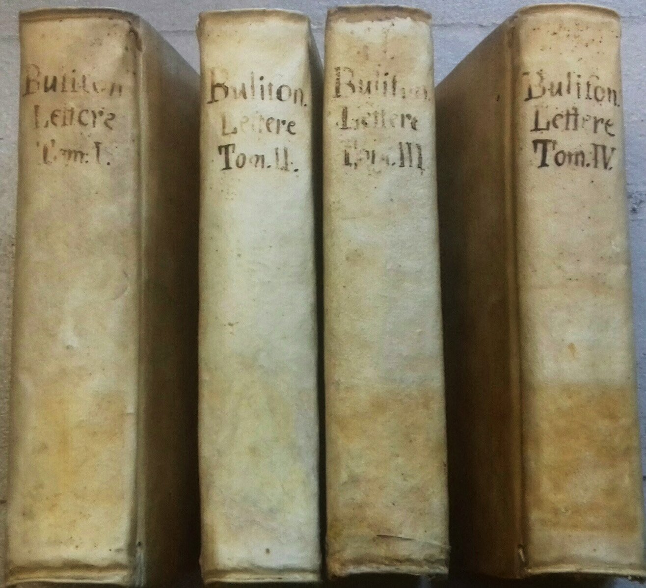 Queste lettere fino ad allora sconosciute e ripubblicate solo nel 1818 a Modena in "Memorie e lettere inedite finora o disperse di Galilei" (Cinti, 188) sono importanti per dirimere la controversia tra Galilei e Scheiner su chi avesse per primo studiato il fenomeno delle Macchie Solari. Il vol IV contiene inoltre altre quattro lettere di interesse galileiano: una di Mario Guiducci al Cesi di faccenda letteraria "ho preso per me il consiglio che V.E. dava al Sig. Galileo" riguardo "il torto che m'è stato fatto senza ragione da quel buon Sig. Grasso" (p.43-44); e tre di Francesco Stelluti tra cui una nella quale invia a Cesi un madrigale per un'opera di Galileo Galilei: le Macchie Solari (p.52-57). Antonio Bulifon (1649-1707) editore francese attivo a Napoli si definiva "semplice libraio ignorante, ma amichissimo dei virtuosi". Il solo Carli Favaro le cita, senza dar loro importanza, ai n. 364, 385, 389. Cat.Libri 1861, n. 3016-17: ''Containing among other highly interesting letters two of Galileo''. Gamba 1959. Vinciana 3361 (solo il vol.I). B. Soria, pag.105; Letters of Galileo Astronomy Physics Sconosciuta al Cinti e a tutti i cataloghi specializzati di Galileiana e di libri scientifici. Gamba 1959. Dura 2290. Cat.Vinciana 3361 (solo il vol.I).