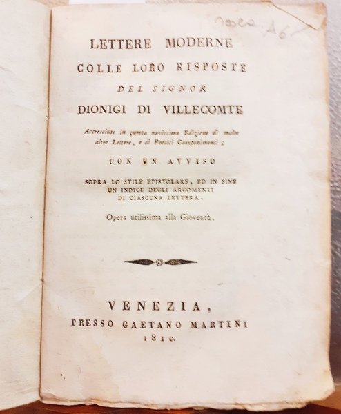 LETTERE MODERNE COLLE LORO RISPOSTE DEL SIGNOR DIONIGI DI VILLECOMTE, accresciute in questa novissima edizione di molte altre lettere, e poetici componimenti., con un avviso sopra lo stile epistolare, ed in fine un indice degli argomenti di ciascuna lettera. Opera utilissima alla gioventù.,