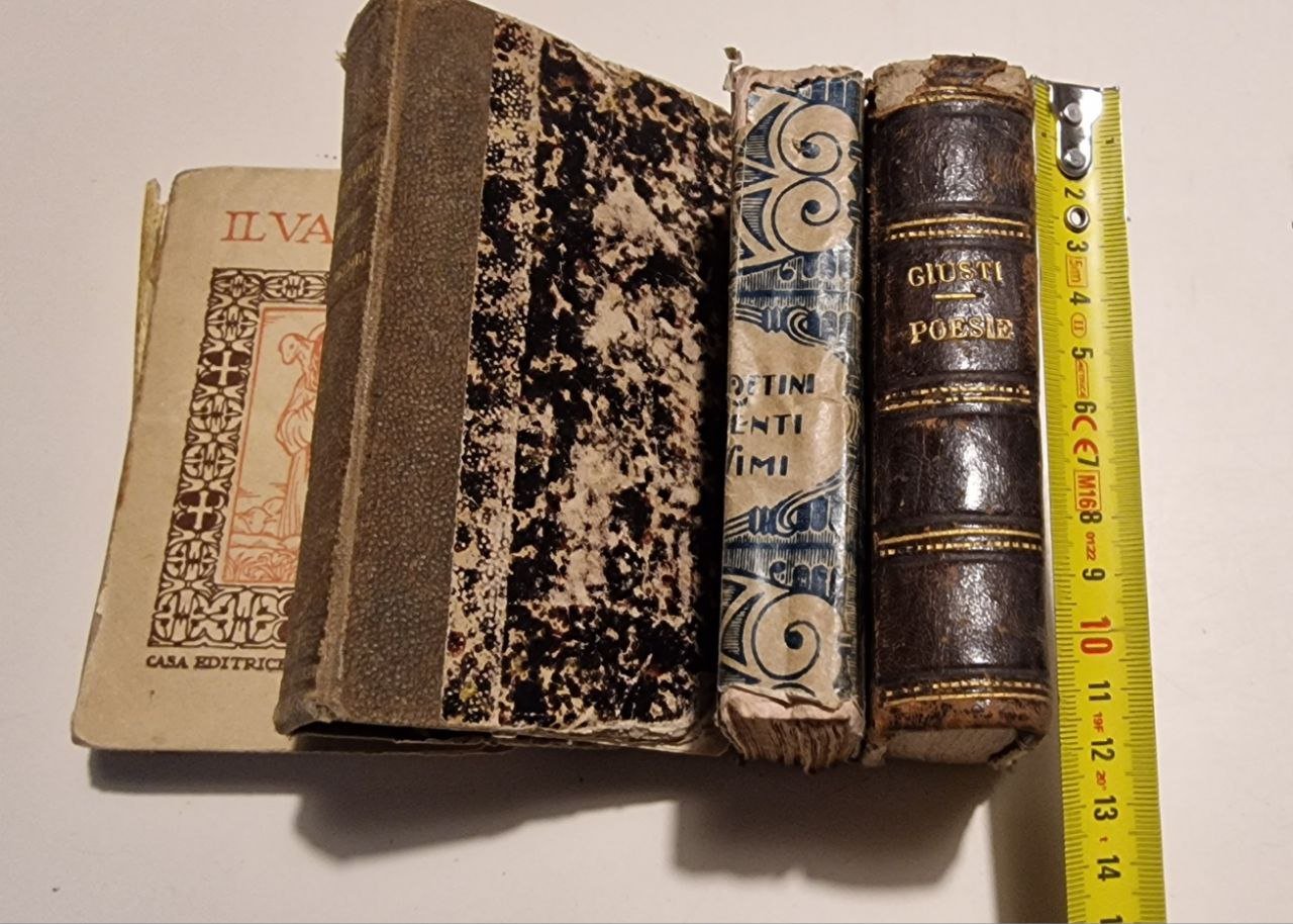 LOTTO 4 PICCOLI VOLUMETTI ANNO 800 E PRIMI 900 - LE POESIE DI GIUSEPPE GIUSTI CON UN DISCORSO SULLE OPERE ANNO 1886 - LE POESIE CANTI DI GIACOMO LEOPARDI CON LE NOTE FILOLOGICHE E I PARALIPOMENI DELLA BATRACOMIACHIA ANNO 1892 (forse manca l'ultima pagina) - LETTERE SCELTE DALLE FAMILIARI ANNO 1837 VENEZIA - IL VANGELO OLGA RIAME, TRADUZIONE E NOTE DEL MONS GRAMMATICA E GIOVANNI CASTOLDI PREFAZIONE GIOVANNI PAPINI ANNI 1924 (manca il dorso)