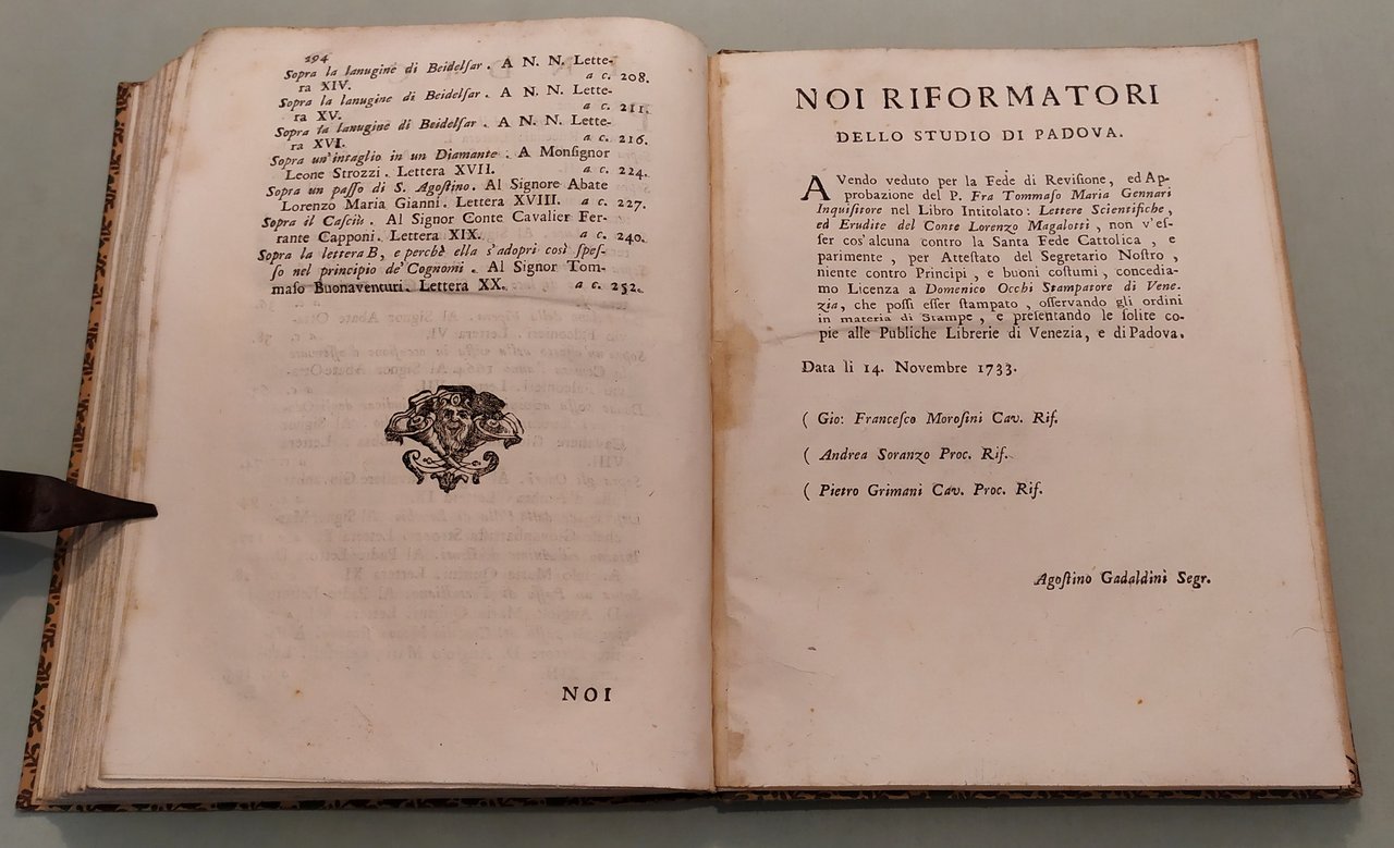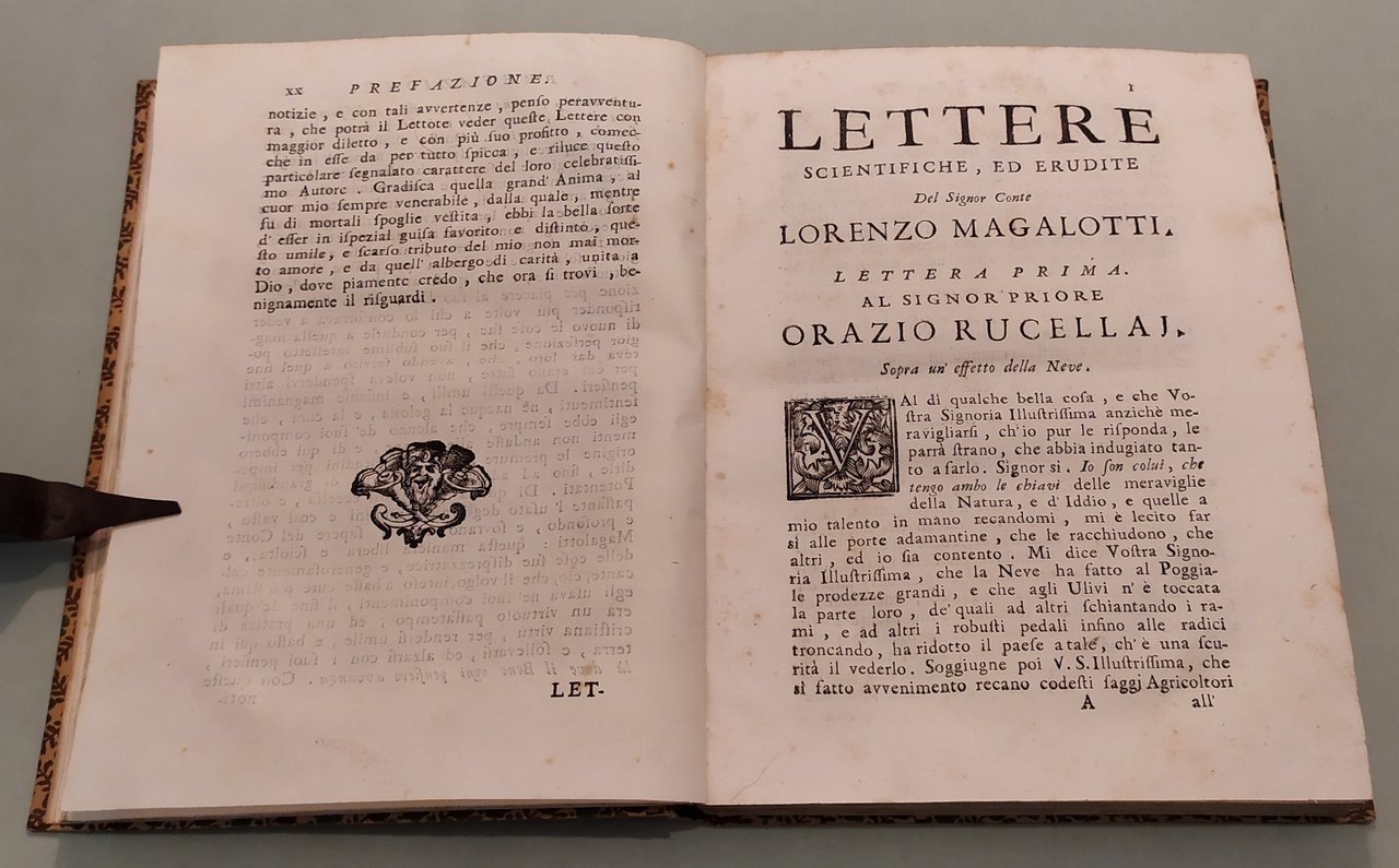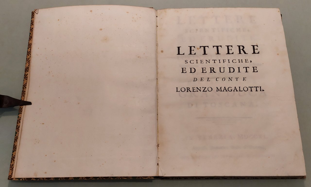 Lettere scientifiche, ed erudite. In Venetia, Appresso Domenico Occhi, 1740. In 8vo; pp.XX, 294, 1n.n. Titolo in nero e rosso. Capilettera e finaletti. Alcune pagine con lievi brunit. Cart. mod. Terza edizione. Riccardi I, 63 n. 2; Cicognara, 1182; Lastri, Bibl. georgica, pag. 78; Moreni II, 9.