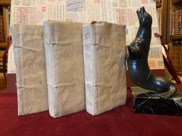 - Opera completa in tre volumi con legature coeve in cartonato muto, carte freschissime e con barbe. Ottime condizioni. Frontespizio stampato in rosso e nero al primo volume.