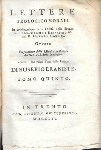Lettere teologico-morali in continuazione della Difesa della Storia del Probabilismo e Rigorismo ec. del P. Daniello Concina ovvero confutazione della Risposta pubblicata dal M.R.P. B. della Compagnia contro i due primi Tomi delle Lettere di Eusebio Eraniste, tomo 5°