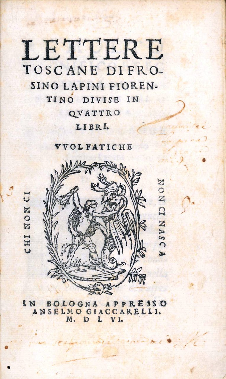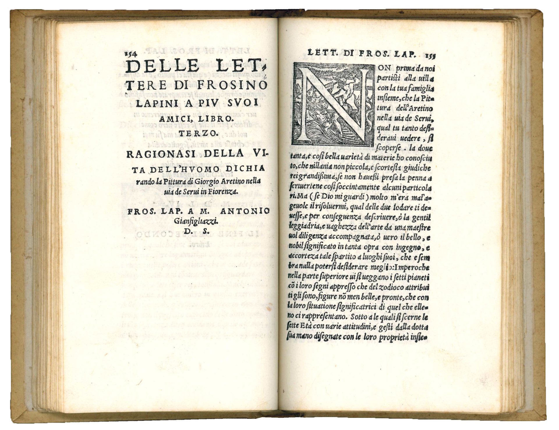 First and only edition dedicated by the author to Ludwig Langenauer (Bologna, February 18, 1556). The collection contains 64 letters divided into 4 books. The letters were all sent from Firenze and Bologna between 1552 and 1556.