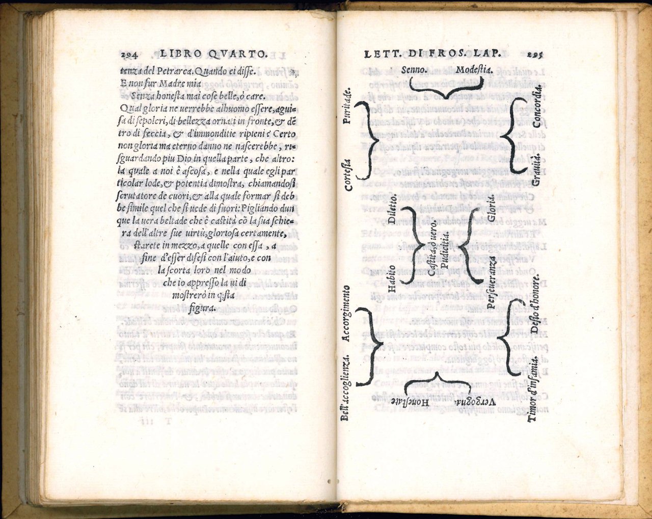 8vo (165x100 mm). [8], 311, [1 blank] pp. Collation: [π]4, A-T8, V4. With the printer's device on title page and a woodcut diagram in the text (p. 295). Decorated initials. Early 19th-century boards with inked title on spine. From the library of Leonardo Trissino (his ownership inscription on the front pastedown dated 1831). Other ownership entry on p. [π]2r, also repeated on last leaf verso with the addition of a verse (“Quel che nel cor si porta, invan si fugge”) taken from Guarini's Pastor Fido, by a certain Francesco Michelucci, possibly the late 16th-century poet and playwright from Pistoia mentioned by V. Capponi in the Biografia pistoiese o notizie della vita e delle opere dei Pistoiesi (Pistoia, 1878, p. 275). Other unreadable notes on the title page by a later hand. Small repaired hole to the lower margin of the first leaf, some light occasional foxing, all in all a very good, wide-margined copy.