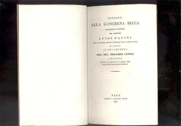 IN 8°, pp.23, COPERTINA IN BROSSURA MUTA MODERNA.LA PLACCHETTA, E' DIVISA IN DUE PARTI : 1) INTORNO ALLA GANGRENA SECCA, RIFLESSIONI CRITICHE DEL DOTTORE LUIGI PACINI PROF.DI NOTOMIA UMANA E COMPARATA NEL R. LICEO DI LUCCA IN RISPOSTA AD UNA LETTERA DEL SIG. ODOARDO LINOLI CHIRURGO. INSERITA NEL FASCICOLO DI GIUGNO 1835 DEGLI ANNALI UNIVERSALI DI MEDICINA. 2) DELL'EFFICACIA DELL'UNGUENTO DI ATROPABELLADONA NELL'ERNIE INCARCERATE. LETTERA DIRETTA AL CH. SIG. DOTTOR TONELLI DI ROMA DAL DOTTOR LUIGI PACINI PROFESSORE DI NOTOMIA UMANA E COMPARATA NEL R. LICEO DI LUCCA. OTTIMA CONSERVAZIONE.ID 3546