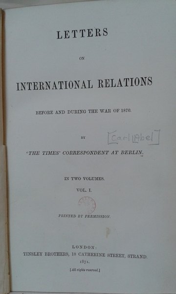 LETTERS ON INTERNATIONAL RELATIONS Before and During the War of 1870 by 'The Times' correspondent at Berlin. Vol.I