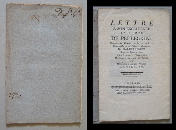 *Lettre a son excellence le Comte De Pellegrini, Chambellan, Conseiller, Actuel d'Etat, Grand - Croix de l'Ordre Militaire de Marie Therese, Colonel Proprietaire d'un Regimenti d'Infanterie, Directeur General du Genie et Marechal dans les Armees De S. M. I. R. Ap. ec. ec.