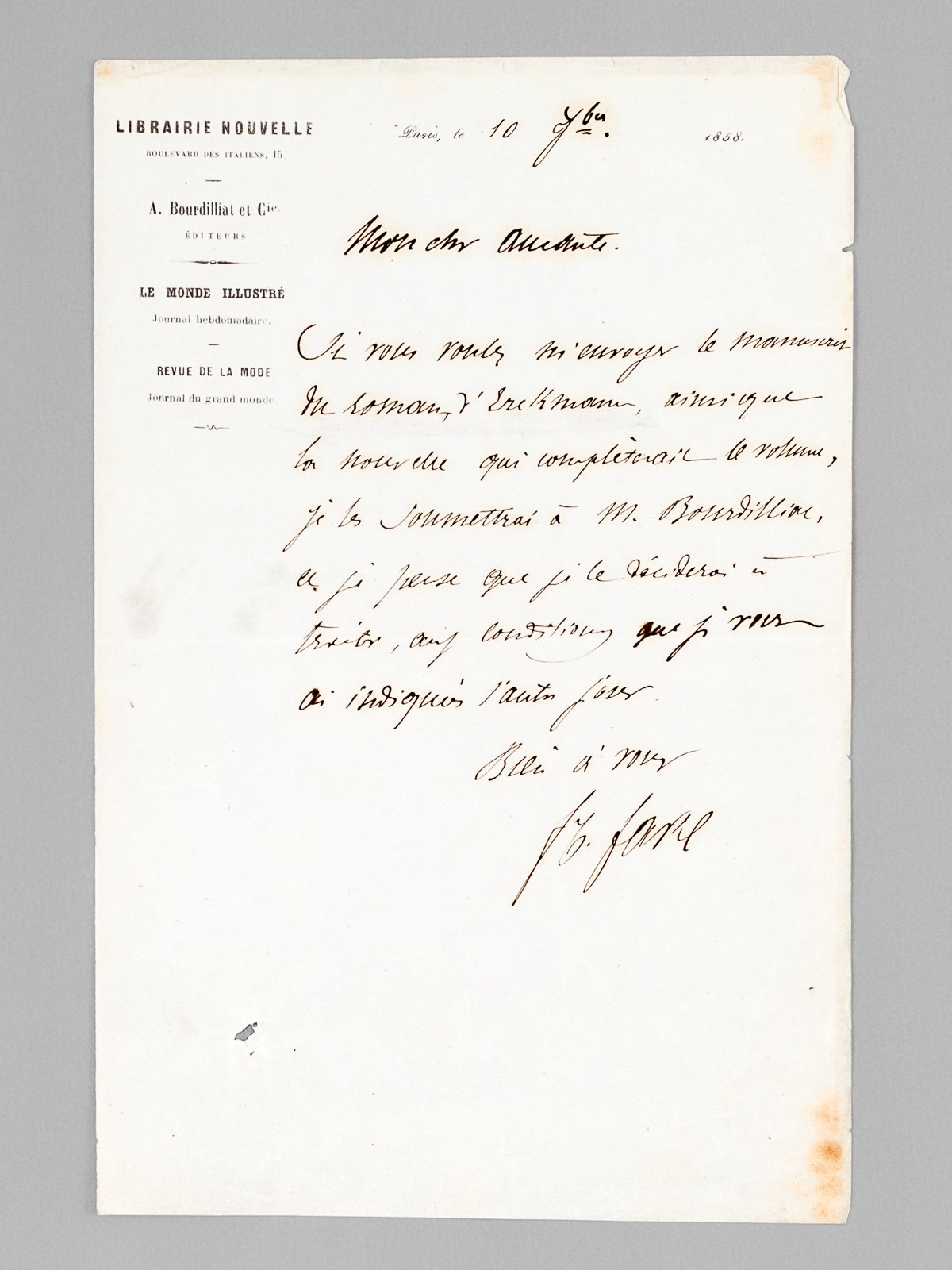 [ Lettre autographe signée adressée à Emile Aucante, à propos d'un manuscrit de roman d'Erckmann-Chatrian ] 1 L.A.S. à en-tête de la Librairie Nouvelle, A. Bourdilliat et Cie, datée de 1858 : "Mon Cher Aucante, Si vous voulez m'envoyer le manuscrit d'Erckmann, ainsi que la nouvelle qui complètera le volume, je le soumettrai à M. Bourdilliat, et je pense que je le déciderai à traiter aux conditions que je vous ai indiquées l'autre jour. Bien à vous"