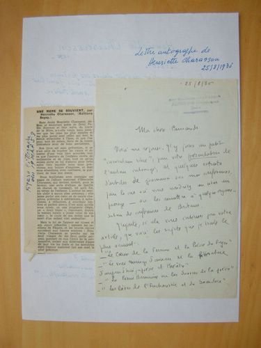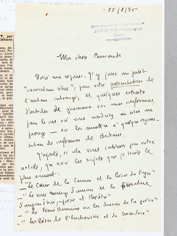 1 L.A.S. d'1 p. in-8 contrecollée sur une feuille A4, lettre datée du 25 août 1936 : "Ma Chère Camarade, Voici ma réponse. J'y joins un petit "curriculum vitae", pour votre présentation de l'auteur interrogé, et quelques extraits d'articles de journaux sur mes conférences, pour le cas où vous voudriez en citer un passage - ou les remettre à quelque organisateur de conférences de Bordeaux. J'ajoute, si cela vous intéresse pour votre article, que voici les sujets que je traite le plus souvent : "Le Coeur de la femme et la Poésie du Foyer" - "Le Vrai mariage d'amour et la littérature d'aujourd'hui, poésie et théâtre" - "La Féérie humaine ou les Sources de la Poésie" - "Les Poètes de l'Eucharistie et du Sacerdoce". Bon état (contrecollée en tête sur une feuille A4)