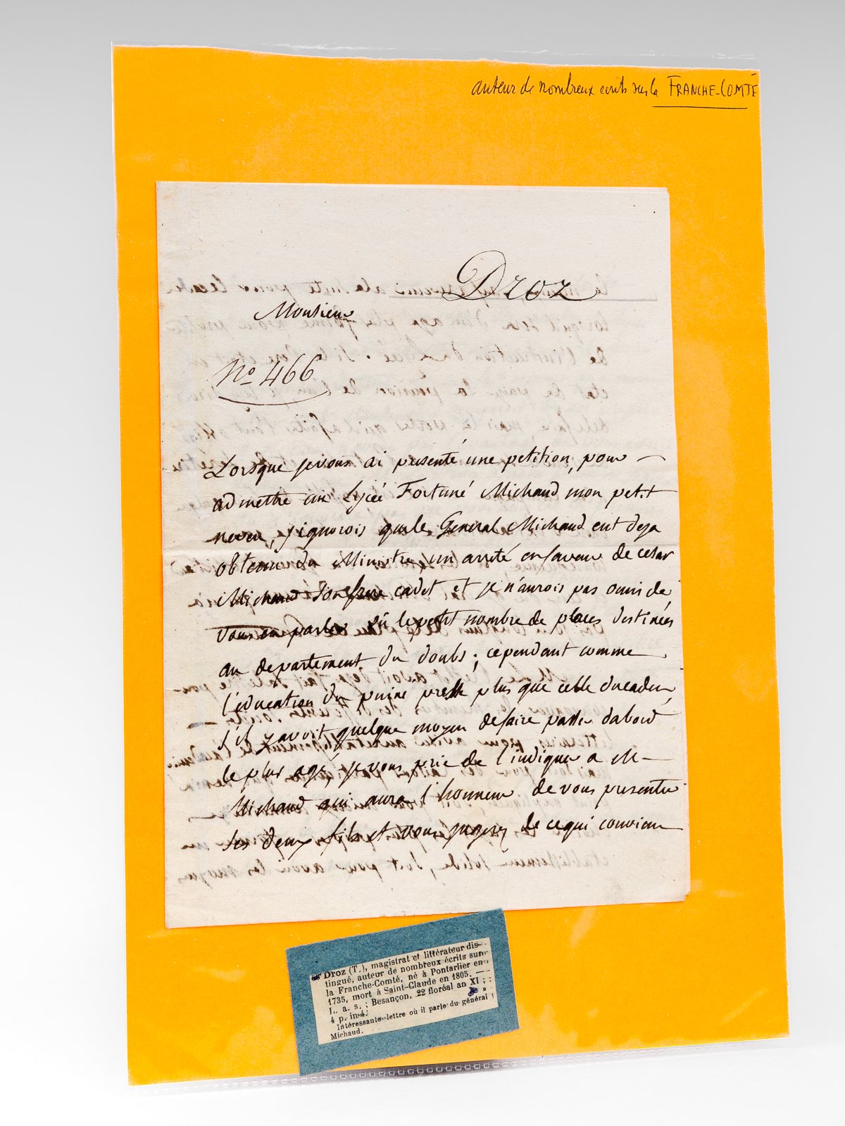 1 L.A.S. de 4 pages, datée de Besançon, le 22 floréal an XI [ 12 mai 1803 ] "Monsieur, Lorsque je vous ai présenté une pétition pour admettre au Lycée Fortuné Michaud mon petit neveu, j'ignorais que le Général Michaud eut déjà obtenu du Ministre un arrêté en faveur de César Michaud son frère cadet et je n'aurais pas omis de vous en parler vu le petit nombre de places destinées au département du Doubs ; cependant, comme l'éducation du puiné presse plus que celle du cadet, s'il y avait quelque moyen de faire passer d'abord le plus agé, je vous prie de l'indiquer à M. Michaud qui aura l'honneur de vous présenter les deux fils et vous jugerez de ce qui convient le mieux, sauf à revenir à la suite pour le cadet lorsqu'il sera d'un age plus formé pour profiter de l'instruction du Lycée. Si le Père était en état de payer la pension de l'un, je lui dirais de le faire, mais les pertes qu'il a faites l'ont obligé de vendre la maison à Pontarlier et de se retirer à la campagne et s'il est possible de faire quelque chose d'extraordinaire cela ne tirera pas à conséquence, vu les services du Général Michaud et ceux du général Michaud [d'arcan ? ] qui n'a pas jouï longtemps de la place de Sénateur" [ Droz évoque sur une page le rétablissement de l'Académie, les remarques du Préfet à ce propos, il évoque M. LeFevre ] "Ayant été pendant 40 ans a portée de reconnaître l'utilité du premier établissement, je mourrai content dès que l'on aura repris le continuation du Recueil des Monumens de notre histoire, que j'avais proposé avant que M. Bertin s'en occupe pour la France entière et que j'avais bien avancé sous ses auspices" [. ] "j'espère que nous n'oterez point ce terme de féodalité de votre Dictionnaire quand il ne restera quand il ne restera qu'un tribut rendu au génie aux talens ou a la beauté. Je suis avec respect, Monsieur, votre très humble et très obéissant serviteur". Intéressant L.A.S. attribuable au juriste et érudit Nicolas Droz (né à Pontarlier en 1735, mort à Saint-Claude en 1805), dans laquelle il parle du Général Michaud, mais aussi du rétablissement prochain de l'Académie ("des sciences, belles-lettres et arts de Besançon et de Franche-Comté"), qui sera effectif l'année suivante, en 1804. Nicolas Droz avait été nommé en 1771 secrétaire perpétuel de l'ancienne Académie, supprimée en 1793. Il était l'oncle du savant Joseph Droz.