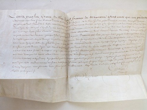 Document sur vélin (parchemin) format 45 x 27 cm : "Louis par la Grace de Dieu, Roy de France et de Navarre, à tous ceux qui ces présentes Lettres verront Salut. Pierre Virens Peintre et Demoiselle Gabrielle Villiers son Epouse, et le Sieur Honoré Gourdain peintre demeurant à La Rochelle, nous ont fait exposer que par Contrat passé devant Bonnaud et son confrère Notaire à La Rochelle, le 29 août dernier . dont l'extrait au terme de l'Edit du mois de Juin 1771 a été exposé l'espace de deux mois en l'auditoire de notre Sénéchaussée de La Rochelle suivant le certificat qu'en a donné Bonin commis de notre Greffier le onze du présent mois, ils ont acquis de Pierre Lachambre Etudiant Pierre Auguste Lachambre Marin et Demoiselle Marie Lachambre demeurant tous à Mauzé les trois quarts dans une petite Maison située à La Rochelle paroisse Saint Jean du Perrot Censive du Roy Moyennant Deux Mille cent livres pour en jouir en toute propriété ses hoirs et ayant-cause comme . leur appartenant à la date du vingt neuf août dernier, lesquel (?) de maison appartenait auxdits Sieur et Demoiselle Lachambre, , ainsi qu'il est énoncé en le contrat devant (ex?) lesdits Sieur Virens, son epouse et Gourdain jouir dudit . et quoique les Privilèges et Hypothèques suivants et conformément à l'Edit du mois de Juin 1771 Nous ont très humblement fait supplier de vouloir bien leur accorder nos Lettres sur ce Nécessaires, aux considérations de notre Conseil qui a vu le contrat. le certificat de dépôt et autres pièces cy attachées, sous le contrescel de notre Chancellerie, nous avons ratifié ledit contrat du 29 août dernier, Voulons qu'il soit exécuté selon sa Teneur ; ce faisant que les Exposants, leurs hoirs et ayants-cause soient reconnus propriétaires incommutables dudit trois quart de maison, circonstances & dépendances, en jouissent et disposent comme de choses à eux appartenantes, purgées des privilèges et hypothèques conformément à notre arrêt du mois de juin 1771. Mandons à nos conseillers de notre Sénéchaussée de La Rochelle qu'ils aient à faire jouir l'exposant de l'effet des présentes, Car tel est notre plaisir : en témoin de quoi nous avons fait mettre notre scel en cesdites présentes. Données à La Rochelle treize décembre mil sept cens quatre vingt sept. Par le Conseil". Les Lettres de ratification purgent les hypothèques. Bon état