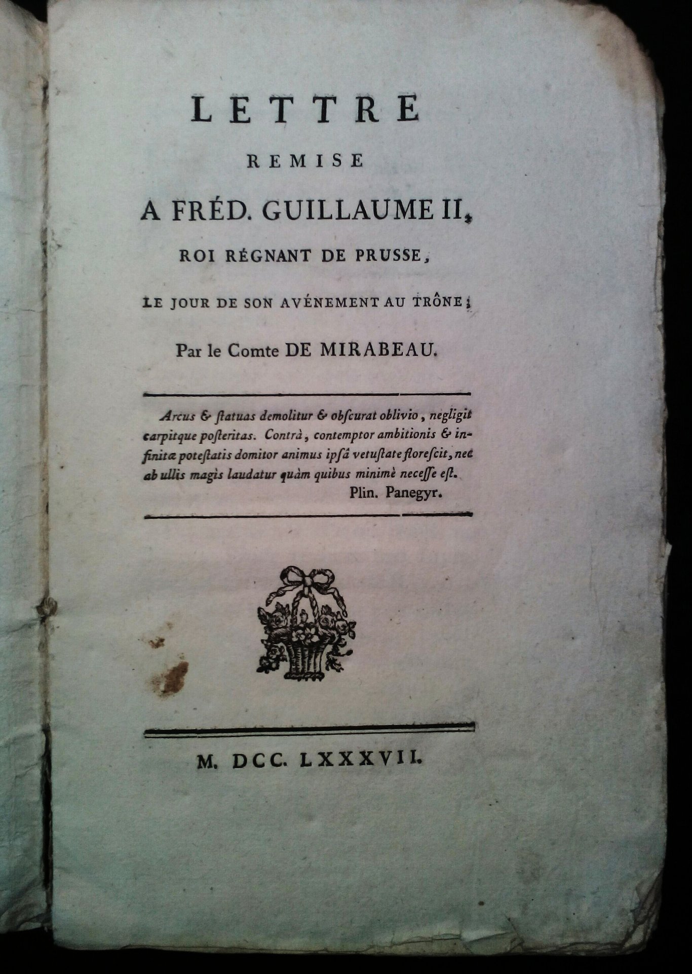 In 8°, p. 62. Stampato nello stesso anno dell'edizione originale. Lettera di Mirabeau a Federico Guglielmo II, nel giorno della sua incoronazione, con esortazioni e consigli. Cartoncino coevo con minime mende.
