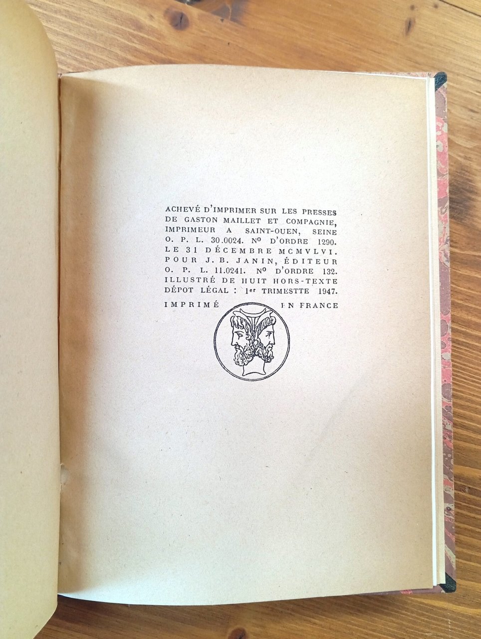 Volume rilegato in mezza pelle bordeaux con nervi, fregi e titolo in oro al dorso, piatti marmorizzati, 211 pagine con otto tavole di facsimili non comprese nel testo. La copertina dell'edizione originale è stata conservata. Lieve, inevitabile brunitura delle pagine, peraltro la copia è in ottime condizioni nelle sue legature ben salde.