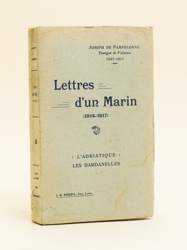 1 vol. in-12 br., J.B. Roudil, Lyon, s.d. (circa 1928) , 238 pp. Etat très satisfaisant (mouill. sur couv., bon état par ailleurs). La première moitié de l'ouvrage est consacrée à son périple sur le contre-torpilleur La Sape, puis à son retour depuis les Dardanelles par le Suffren, et son abordage par l'Oswald. Il embarque ensuite sur le Patrie pouis le Longhi, avec de couler avec le contre-torpilleur grec Doxa, torpillé le 27 juin 1917.