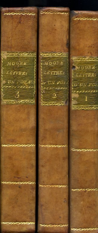 3 voll. in-8° (204x131mm), pp. (4), 362 (di seguito sono ripetute le pp. 141-142); (4), 362, (2); (4), 423; legatura coeva m. pelle marrone e angoli con dorso adorno di titolo, segnatura di volume e fregi in oro su tassello al dorso. Piatti marmorizzati policromi. Bell'esemplare con qualche minima fioritura. Prima traduzione francese (sono presenti i primi tre volumi su quattro), dovuta a Henri Rieu, di queste lettere di viaggio del Moore relative a Francia, Svizzera, Italia e Germania. Tra le località toccate nell'itinerario, ricco di notazioni sugli usi e i costumi e sull'organizzazione sociale dei diversi luoghi: Parigi, Ginevra, Losanna, Berna, Strasburgo, Mannheim, Francoforte, Brunswick, Hannover, Potsdam, Berlino, Dresda, Vienna, Venezia, Padova, Ferrara, Bologna, Pesaro, Fano, Senigallia, Ancona, Loreto, Spoleto, Terni, Narni, Civita Castellana, Roma e la campagna di Roma. L'edizione originale inglese ('A View of Society and Manners in Italy, Germany, Switzerland and France') era apparsa a Londra nel 1779. Il Moore (Stirling, 1729-Londra, 1802), medico e letterato scozzese, prestò servizio in gioventù negli ospedali militari di Maastricht e di Flessingue. Chirurgo militare al seguito degli inglesi a Breda, dopo la Pace del 1748 fece ritorno a Londra. Stabilitosi poi a Parigi, prestò servizio come medico privato del conte di Albermarle, ambasciatore inglese alla corte francese. Tornato ancora in Inghilterra, esercitò la chirurgia a Glasgow. Negli anni '70 del Settecento intraprese il suo grande viaggio nel continente al seguito di un figlio della duchessa di Argyle, viaggio che poi darà vita al presente volume. Egli lasciò anche volumi medici, romanzi moraleggianti (uno dei quali, 'Zeleuco', influenzò Byron), considerazioni sulla Rivoluzione Francese (al cui scoppio egli aveva assistito di persona), ecc. Pine Coffin, 775/3: 'Standard tour, beginning at Venice, in 1775-76, at the end of a general continental tour. Moore travelled as governor to the Duke of Hamilton and to his own son, later Lieut.-Gen. Sir John Moore. This is one of the most sober and well balanced views of Italy in the eighteenth century'. Cox, I, p. 150. D'Ancona, p. 109. Manca a Fossati Bellani.