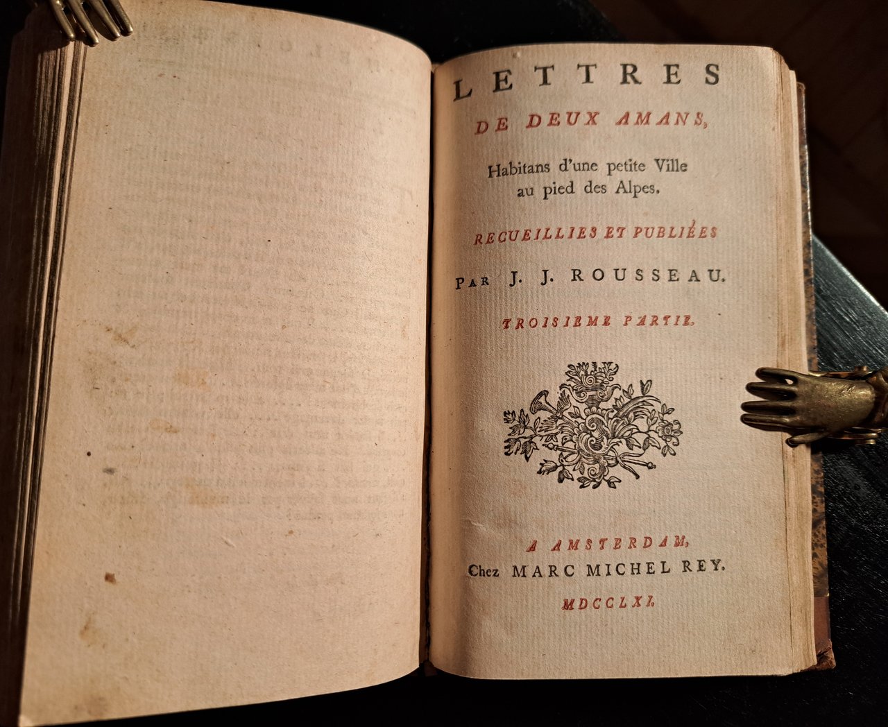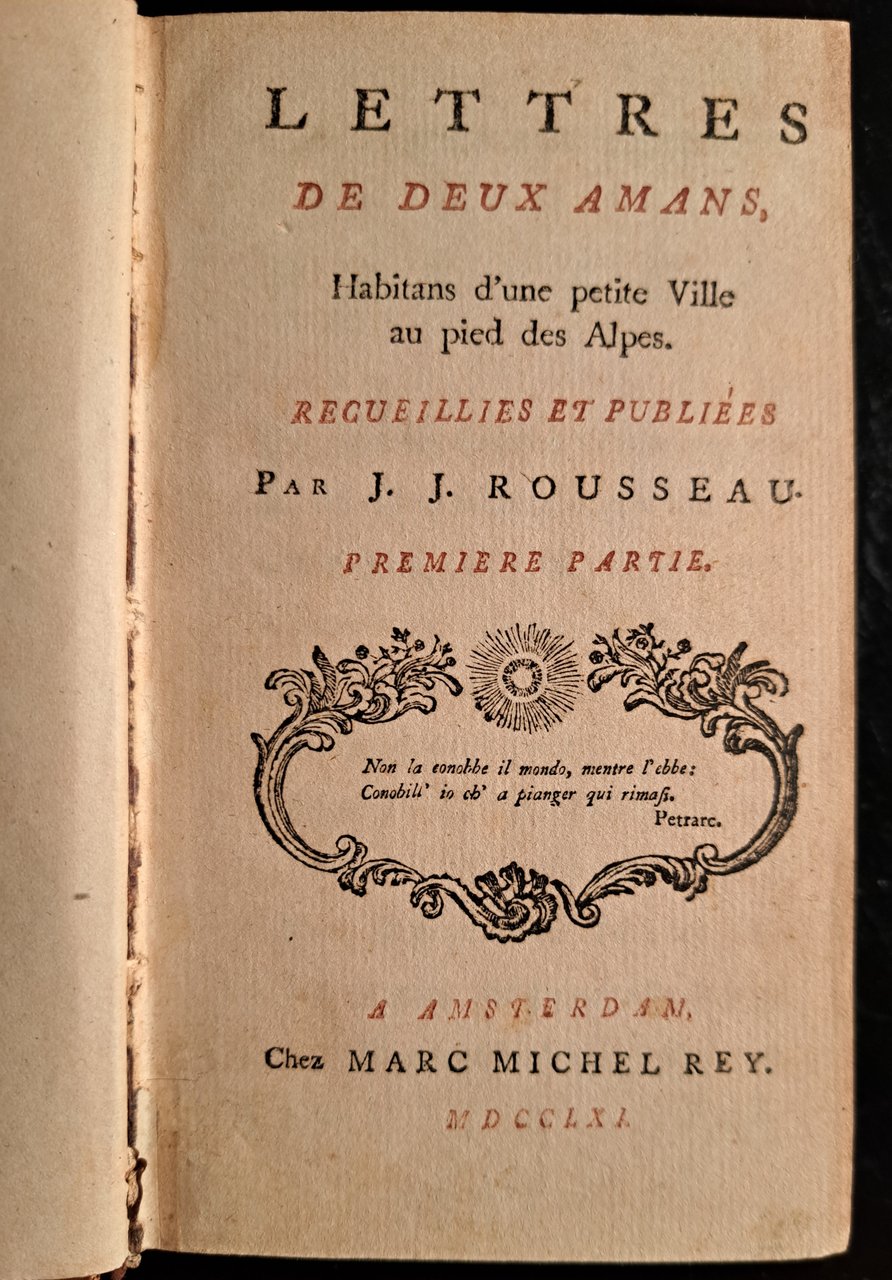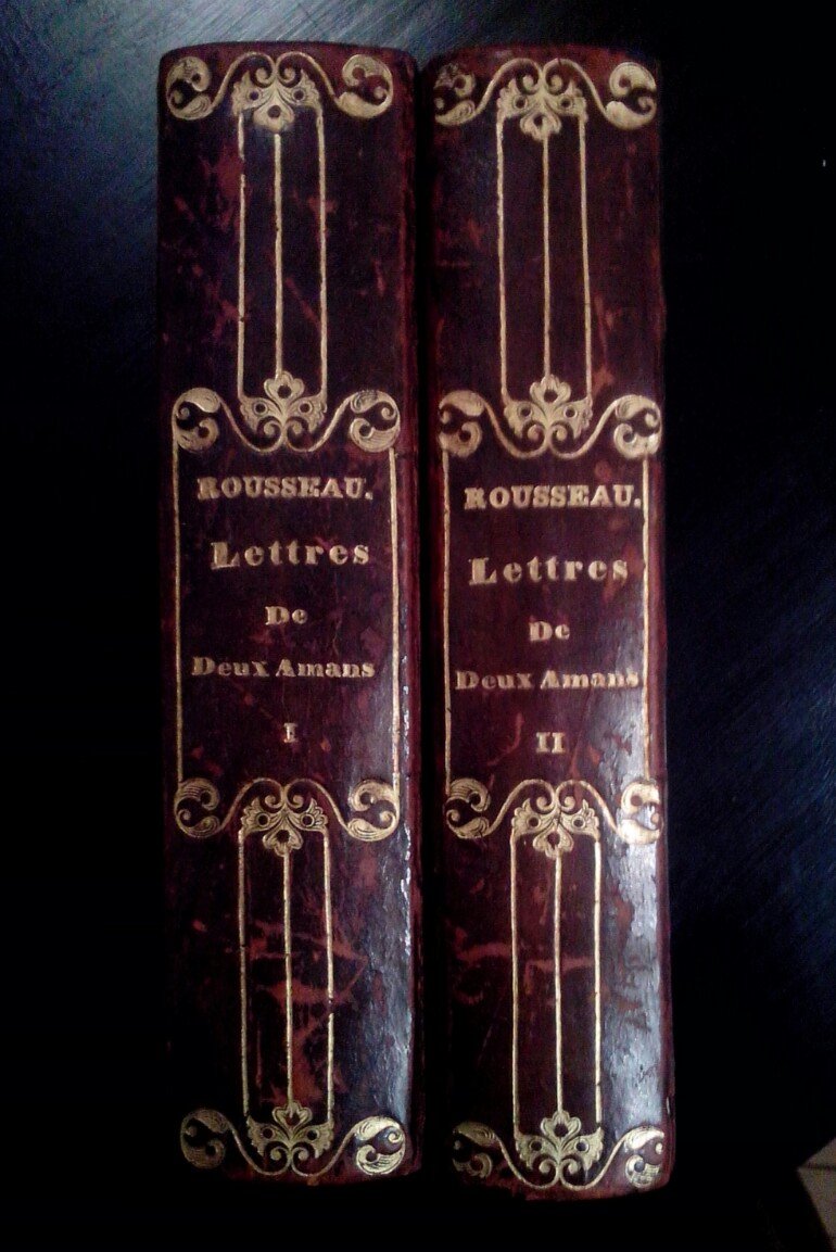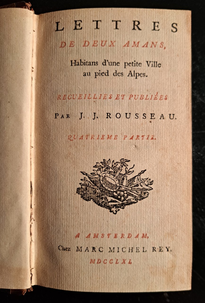 6 parti in 2 voll. In 12°, pag. (10)228; (2)171,b; (2) 135, b; (2) 183,b; (2) 166, cb; (2) 162. 6 frontespizi in bianco e rosso. Contraffazione inglese dell'edizione originale della Nouvelle Héloïse, dello stesso anno. La 6° parte contiene Lettres de deux amans. Ottimo esemplare. Bella legatura "romantica" in mezza pelle con fregi e titoli in oro ai dorsi.