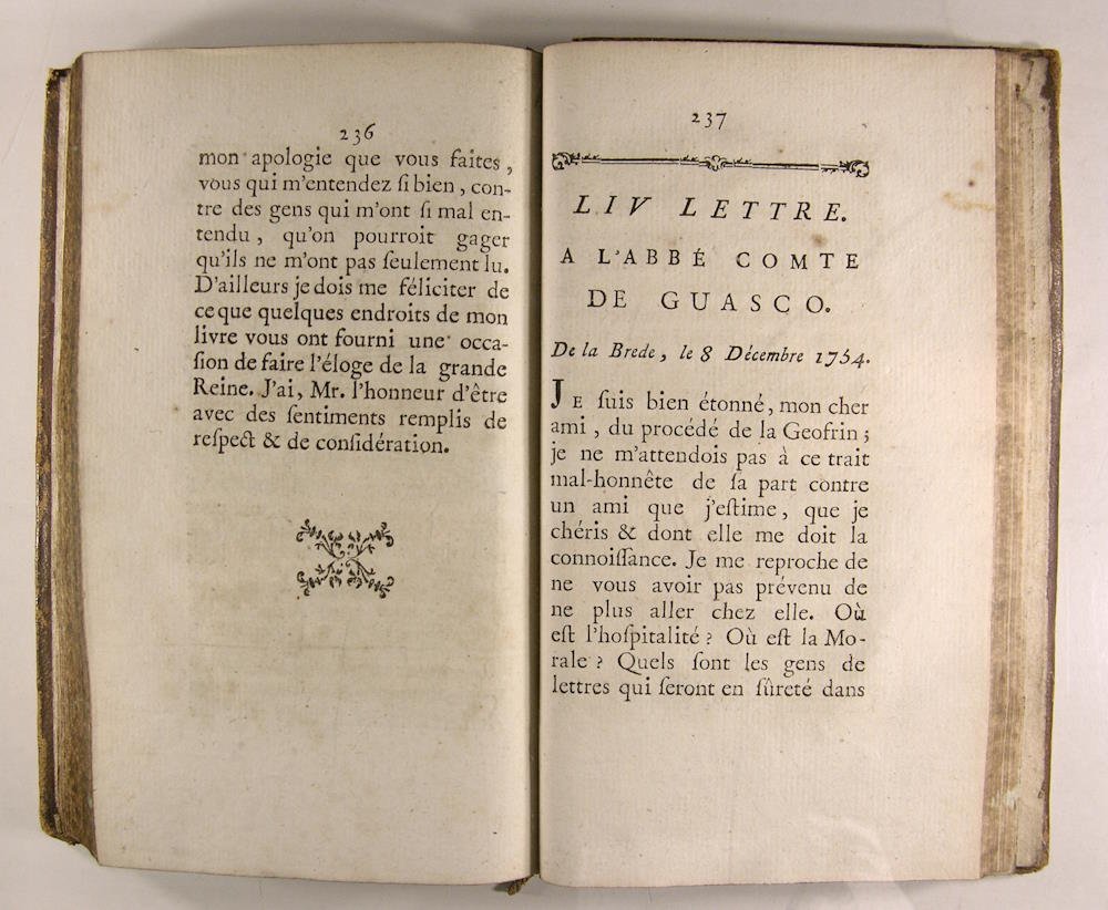 Sans lieu ni éditeur, 1767, in/12, pleine reliure d'époque, dos orné à cinq nerfs, pièce de titre, 285 pages. Ex-libris de la bibliothèque de F. Renard. Contient les deux lettres (Lettre 54 et Lettre 55) visant Mme de Geoffrin, qui tenait son célèbre salon, avait pourchassé impitoyablement les exemplaires de l'édition originale, publié à la même date, afin de les détruire.
