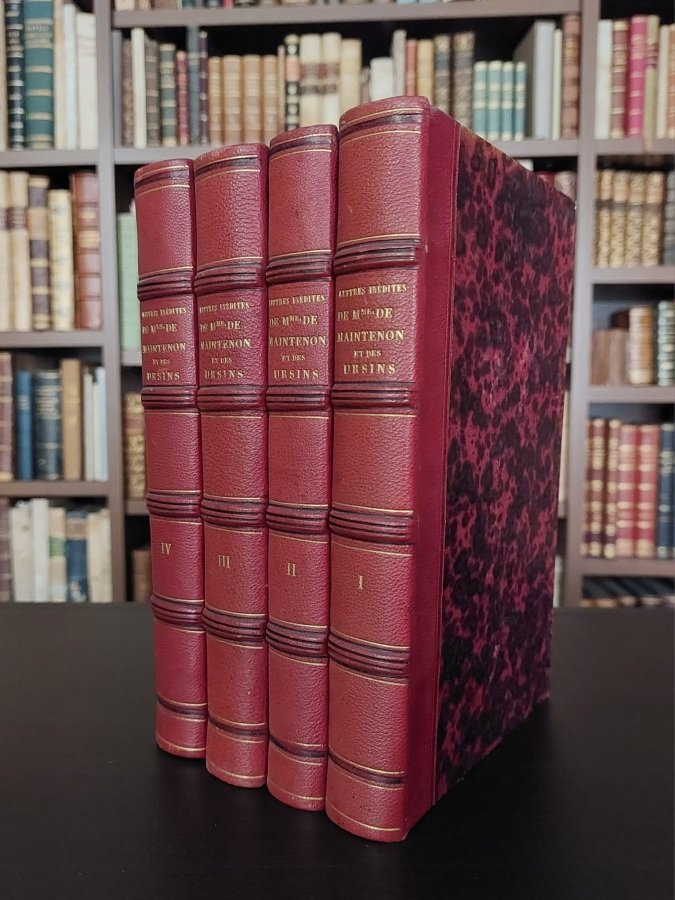4 volumi in-8° (cm. 21,1), legature coeve in mezza pelle rossa, titoli in oro ai dorsi con filetti in oro e in nero ai nervi (lievi abrasioni ai piatti), risguardi marmorizzati; carte in buono stato (alcune fioriture). Prima edizione di questa importante corrispondenza sugli affari spagnoli, tra Madame de Maintenon e Marie-Anne de La Trémoille, principessa des Ursins, dama di compagnia della regina di Spagna, moglie di Filippo V. Antico Ex libris araldico applicato ai contropiatti. Buon esemplare. (NA4)