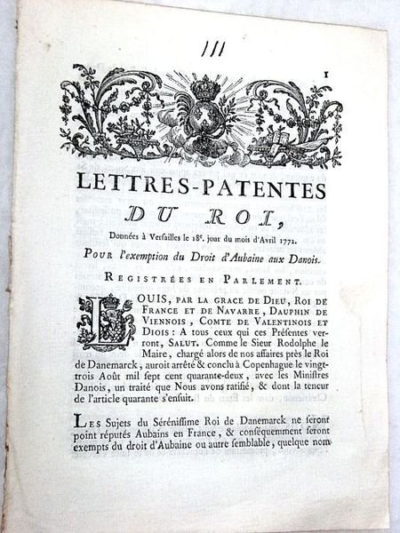 LETTRES PATENTES du roi, données à Versailles le 18e. Jour d'avril 1772. Pour l'exemption du Droit d'Aubaine aux Danois.