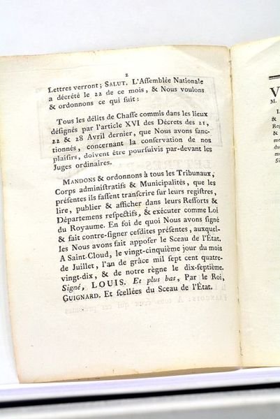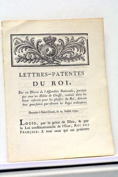 LETTRES-PATENTES du Roi, sur un décret de l'Assemblée Nationale, portant que tous les Délits de Chasse, commis dans les lieux réservés pour les Plaisirs du Roi, doivent être poursuivis par-devant les juges ordinaires.