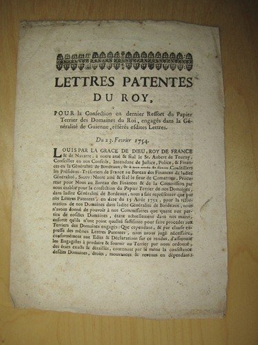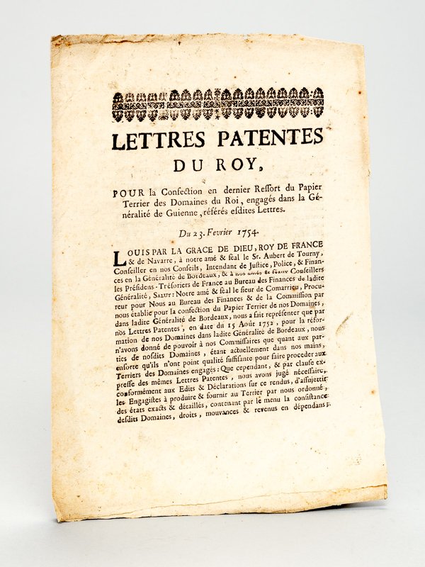 Lettres Patentes du Roy, pour la Confection en dernier Ressort du Papier Terrier des Domaines du Roi, engagés dans la Généralité de Guienne, référés esdites Lettres. Du 23 Février 1754. "Louis par la Grace de Dieu, Roy de France & de Navarre, à notre amè & féal le Sr. Aubert de Tourny, Conseiller en nos Conseils, Intendant de Justice, Police & Finances en la Généralité de Bordeaux."