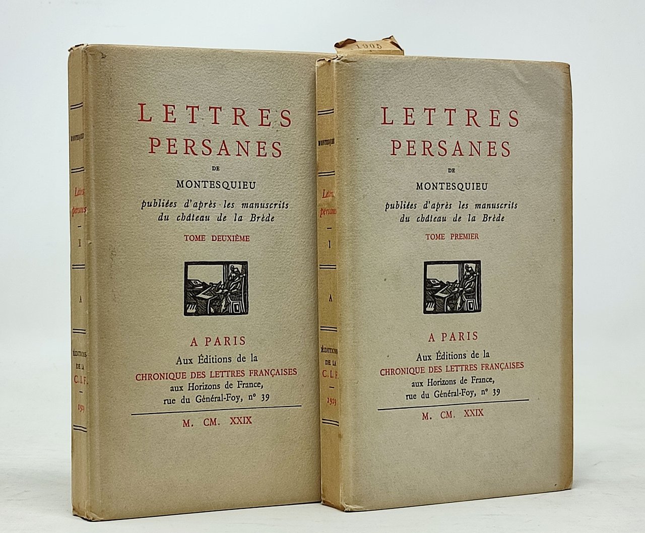 Stampato il 31 maggio 1929. Tiratura limitata a 2.000 esemplari numerati (esemplare n. 1905 'sur vergé teinté d'arches, filigrané au titre de la collection'). Lingua del testo: francese. Formato: 11,5 x 19 cm circa. Stato di conservazione: si segnalano, su entrambi i tomi, due bruniture speculari tra di loro (sul margine superiore del frontespizio e sulla pagina ad esso frontale con la giustificazione della tiratura) causate da un piccolo foglietto(editoriale in quanto su du esso è stampato il numero dell'esemplare) conservato tra di esse negli anni ma nel complesso, un esemplare decisamente ben conservato. Pagine interne ancora completamente intonse. Da collezione. Con due piccole incisioni in nero (una sulla sovraccoperta ed una sul frontespizio).