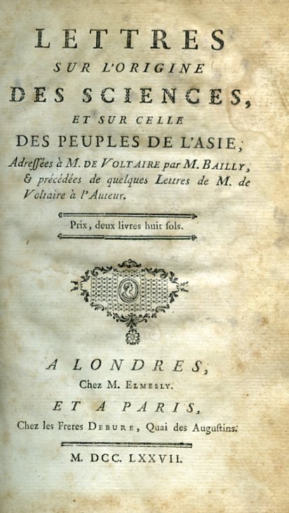 Lettres sur l'origine des Sciences, et sur celle des Peuples de l'Asie, adressées à M. de Voltaire, & précédées de quelques Lettres de M. de Voltaire à l'Auteur