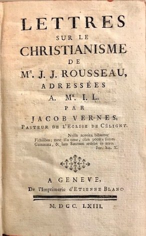 8vo (cm. 18), 1 c.nn., 128 pp. Legatura coeva in piena pelle maculata con ricchi fregi e titolo impresso in oro al ds. (minime tracce d’uso marginali). Tagli rossi. Firma di appartenenza cassata sulla carta di guardia libera anteriore. Esemplare in ottimo stato di conservazione. Rara edizione originale. l’Autore, teologo e pastore protestante a Ginevra, intrattenne corrispondenze con Voltaire e Rousseau.