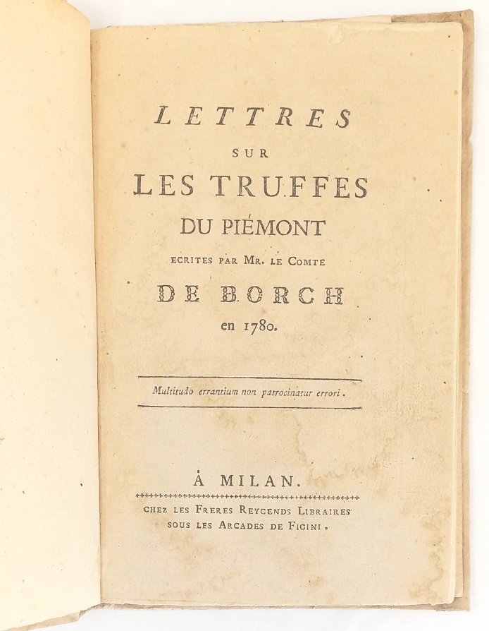 >in-8 (mm 200x129), pp. VIII, 3 a 51, (1 di Errata), cartonato rustico coevo, titolo manoscritto in inchiostro antico al dorso. Con 3 tavole ripiegate raffiguranti il celeberrimo tubero, incise a colori da Louis Charles Gautier D'Agoty. Il conte polacco Michel-Jean de Borch, naturalista e viaggiatore, dopo un soggiorno nel Monferrato descrisse dettagliatamente le caratteristiche morfologiche ed organolettiche di alcune specie di tartufi ("deux espèces de truffes blanches (tuber albidum et bianchetti), qui croissent dans le Piémont et dont la finesse est proverbiale." Interessante studio sui tartufi bianchi piemontesi, di notevole rarità ed importanza scientifica e gastronomica. E' scritto in forma di tre lettere inviate al marchese di Balbiano ed al conte Morozzo. I D'Agoty furono tra i primi inventori dell'arte d'incidere a mezzotinto a più colori, mediante la tricromia: ''consistait à imprimer avec trois planches préparées au berceau, encrées en bleu, jaune et rouge, de telle sorte que les autres couleurs fussent obtenues par superposition et les valeurs par le jeu du brunissoir sur le cuivre bercé de chaque planche... On connaît très peu de pièces de Louis d'Agoty et ces 3 planches ont échappé à l'Inventaire du Fonds français, X, p. 92'' (Oberlé, nei suoi Fastes de Bacchus). Riferisce della presenza di ''filamenti'' (ife) e ''semi'' spore, in grado di determinare la crescita a distanza. Escludendo l'ipotesi della germinazione spontanea dei tuberi, sostenne il ruolo essenziale di taluni alberi d'alto fusto nella crescita dei tuberi. Indica i terreni idonei alla loro vegetazione, in particolare di un tartufo meno pregiato, ma presente sul territorio piemontese, allora noto con il nome di Bianchetto, che nel 1788 avrà la sua definitiva classificazione tra i miceti ipogei come Tuber Borchii. E' nota una prima tiratura con l'Errata impressa al recto di un foglio aggiunto, invece che al verso dell'ultimo f. come il presente. Rarissimo libretto. Qualche alone limitato al frontespizio, per il resto ottimo esemplare. Pritzel 996. Vicaire 104. Schliemann 154. Georg 172. Oberlé, ''Fastes'', 721. Manca a Bitting, Nissen, Simon, Westbury.