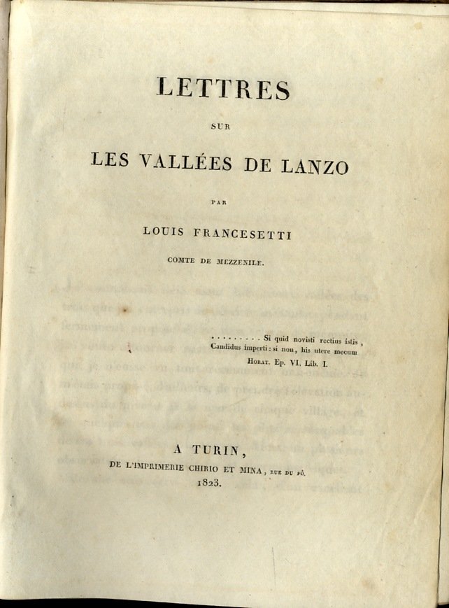 >in-4, pp. VII, 144, leg. coeva m. pelle, tit. su tassello e fregi oro al dorso. Prima edizione adorna di una carta corografica delle Valli litogr. dall'Arghinenti e di 11 vedute delle località più caratteristiche delle Valli di Lanzo, litogr. dal Denina dai disegni dell'a. (Ponte del Diavolo e di Germagnano, Mezzenile, Santuario di S. Ignazio, Pic. di S. Cristina, Vallone di Sea, Cascata di Mondrone, Roccia di Venoni, Forno di Lemie, Sommità del Rocciamelone). Vedute affascinanti, tra le prime realizzate in litografia in Piemonte. Le Lettere descrivono le risorse naturali, artistiche ed economiche della regione, gli usi degli abitanti e le ascensioni effettuate dall'autore sui monti. (Fioriture della carta). Manno 32922.