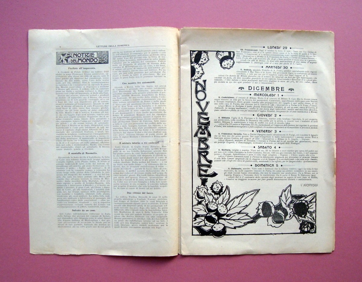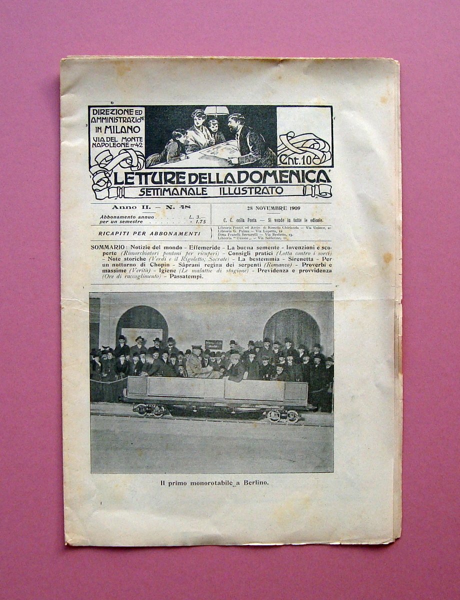 Periodico, Letture della Domenica" settimanale illustrato Anno II N.48 28 novembre 1909 Il Primo monorotabile a Berlino Milano, 1909; cm 32x22, pp. 14, bella ill a colori in copertina e molte ill. fot. in b/n nel t. e f.t. + inserz. pubblicitarie dell'epoca.Numero completo. Condizioni di conservazione Esemplare in buone condizioni con minime tracce d'uso e del tempo, margini con bruniture e piccoli strappetti, traccia di piega conservativa, per le condizioni vedi foto. Numero completo. SC03.D17668 blu "