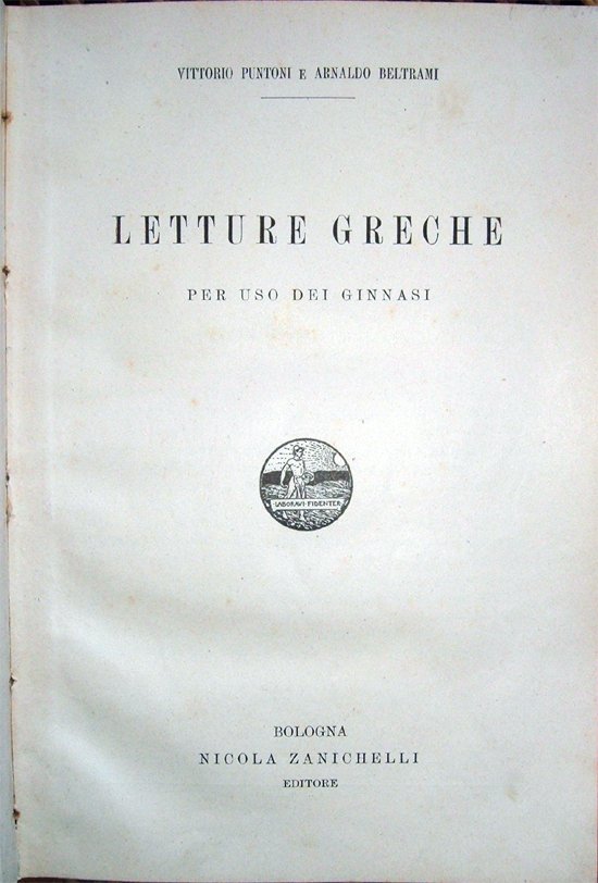 In-8°, pp. (4), X, (1), 259, (1), legatura coeva in mezza tela. Alcune note manoscritte a matita alle prime cinque pagine. A pagina 241, strappo restaurato precedentemente, mediante velatura: il restauro non pregiudica la leggibilità del testo. Pagine con normale patina del tempo, per il resto, esemplare in buono stato di conservazione. Indice: I. Favole esopiche; II. Favole e novelle orientali; III. Narrazioni mitologiche; IV. Anacreontee; V. Epigrammi; VI. Sentenze; VII. Da Luciano; VIII. Da Senofonte; IX. Da Erodoto; Vocabolario (da pagina 177 a pagina 259).