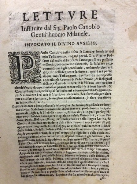 In-4 (mm. 312x210), plaquette di 8 pp.nn., in cartelletta mod. "Edizione originale" a stampa del documento manoscritto con il quale il nobile milanese Paolo Cannobio il 13 marzo 1554 lasciò i suoi beni per istituire le famose Scuole Cannobiane di Milano.Alle pagg. 1-6 si legge in italiano il suo testamento. Egli vuole che la sua casa diventi una scuola dove un docente di particolare prestigio e di grande cultura in campo latino e greco insegni filosofia e morale. I testi base saranno quelli di Aristotile. Il docente sarà retribuito con 250 scudi d'oro ogni anno, oltre al possesso e all'uso della casa. Deve essere un laico di specchiata moralità; non vi potrà mai insegnare un docente appartenente a ordini o congregazioni religiose. Accanto a lui dovrà insegnare anche un docente di logica, sempre laico, con un compenso annuo di 60 scudi d'oro. La parte centrale del testamento (pp. 3-4) è occupata dalla minuziosa descrizione di come si devono svolgere le lezioni e degli esami relativi. Ritiene che sarà necessario costruire un nuovo edificio, come auditorio', più grande e spazioso. Infine pone la sua scuola sotto il controllo e la protezione del Collegio dei giureconsulti di Milano.Le Scuole Cannobiane mantennero sempre il carattere di laicità voluto dal loro fondatore; vi si insegnò soprattutto filosofia, ed ebbero un grande sviluppo nei secoli XVI e XVII; fra i professori più noti ci fu anche Ludovico Settala. Il nuovo edificio, previsto dal Cannobio, fu affidato al progetto presentato dal celebre architetto Galeazzo Alessi. Nel 1770 le Cannobiane vennero soppresse e poi fuse con le Scuole Arcimboldi. Nel 1776 il loro edificio venne abbattuto per far posto al Teatro alla Scala.Esemplare con lievi aloni.