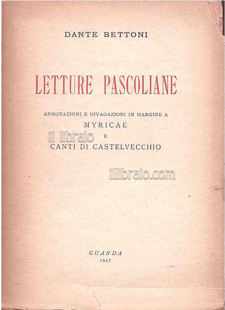 in 16°; pp. 156; br. Annotazioni e divagazioni in margine a Myricae e Canti di Castelvecchio. Tiratura numerata (in gran parte intonso)