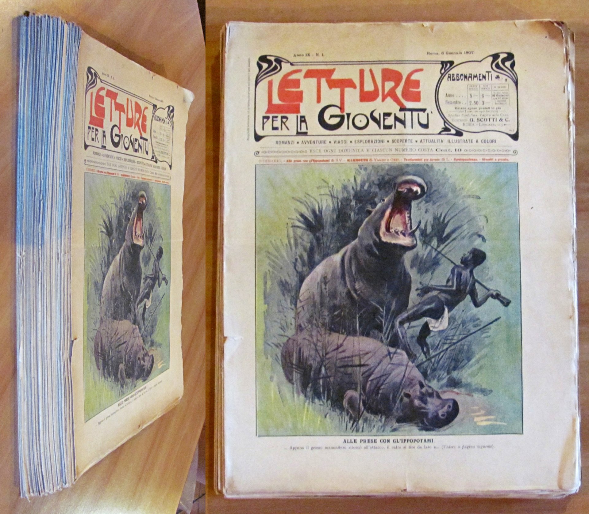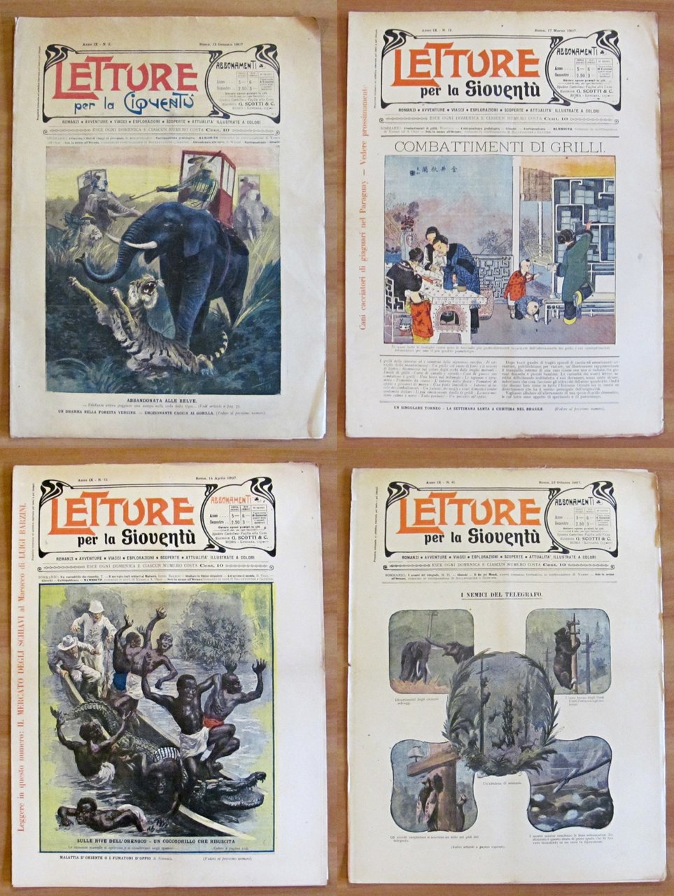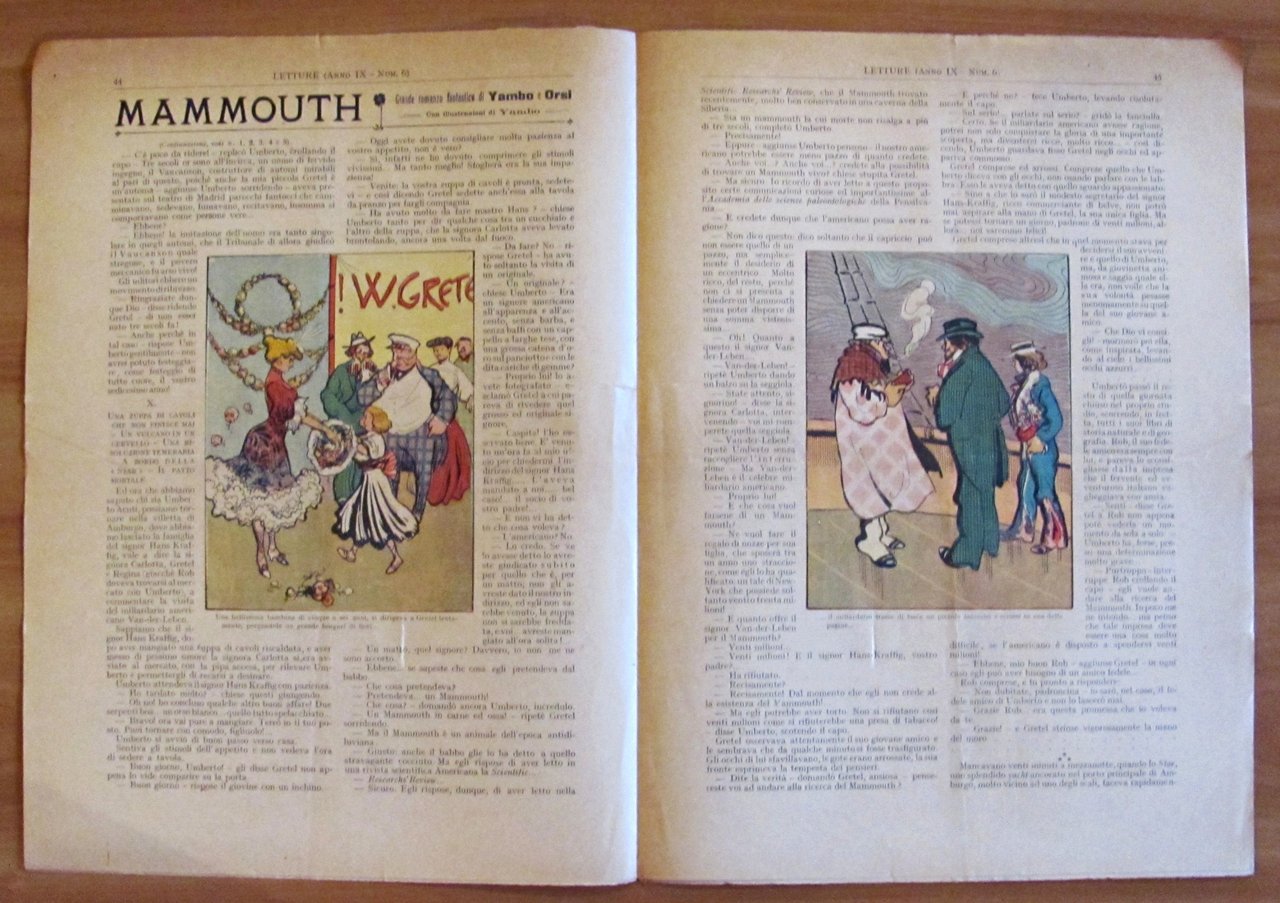 Letture per la gioventù. 51 Fascicoli sciolti (-N.18, N.35, N.39, N.44, N.49). Copertine a colori e illustrazioni in b/n e a colori n.t. in ogni fascicolo. Dal N.1 al N.23 "Mammouth", grande romanzo fantastico di Yambo e Orsi. Dal N. 34 al N.51 "Il Re dei mondi", nuovo romanzo fantastico di Yambo. Ed. G. Scotti - Roma, 1907. Fascicoli editoriali con minime imperfezioni del tempo. 28x38; pp.8 cad. Molto Raro e in Buonissimo stato. , Molto buono (Very Good)