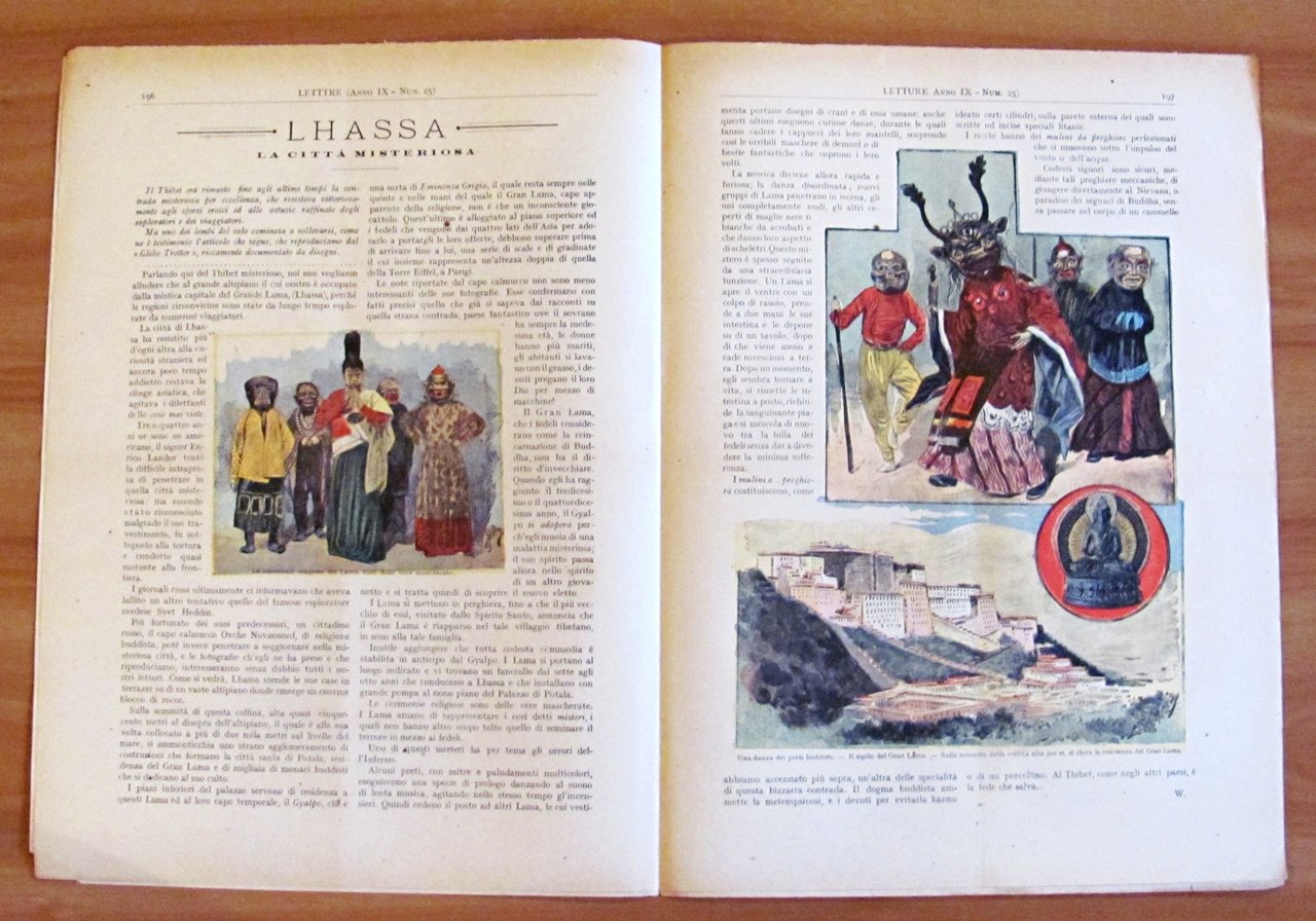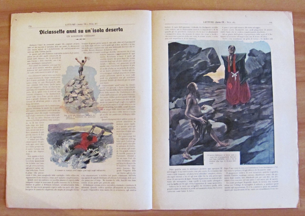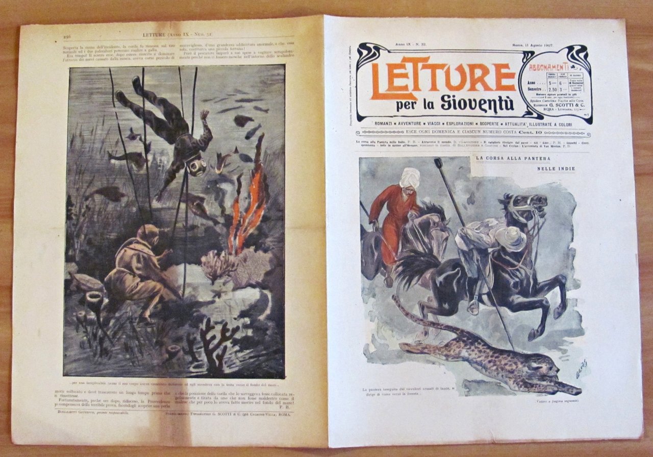 Letture per la gioventù. 51 Fascicoli sciolti (-N.18, N.35, N.39, N.44, N.49). Copertine a colori e illustrazioni in b/n e a colori n.t. in ogni fascicolo. Dal N.1 al N.23 "Mammouth", grande romanzo fantastico di Yambo e Orsi. Dal N. 34 al N.51 "Il Re dei mondi", nuovo romanzo fantastico di Yambo. Ed. G. Scotti - Roma, 1907. Fascicoli editoriali con minime imperfezioni del tempo. 28x38; pp.8 cad. Molto Raro e in Buonissimo stato. , Molto buono (Very Good)