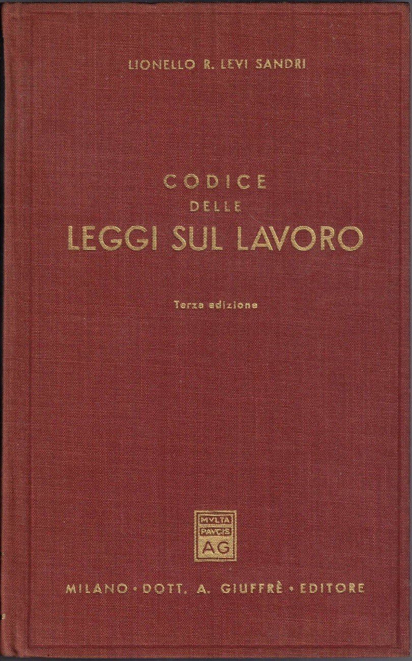 Lionello R. Levi Sandri, Codice delle leggi sul lavoro, Dott. A. Giuffrè Editore, Milano 1974, terza ed., pp. XVI, 3025, cm 20, legatura in tutta tela ed. con titoli al dorso e al piatto. Collana Collezione legislativa. Leggere tracce d’uso, piccola abrasione a margine della prima carta di guardia, minime fioriture ai tagli, lieve brunitura della carta, per il resto buon esemplare.