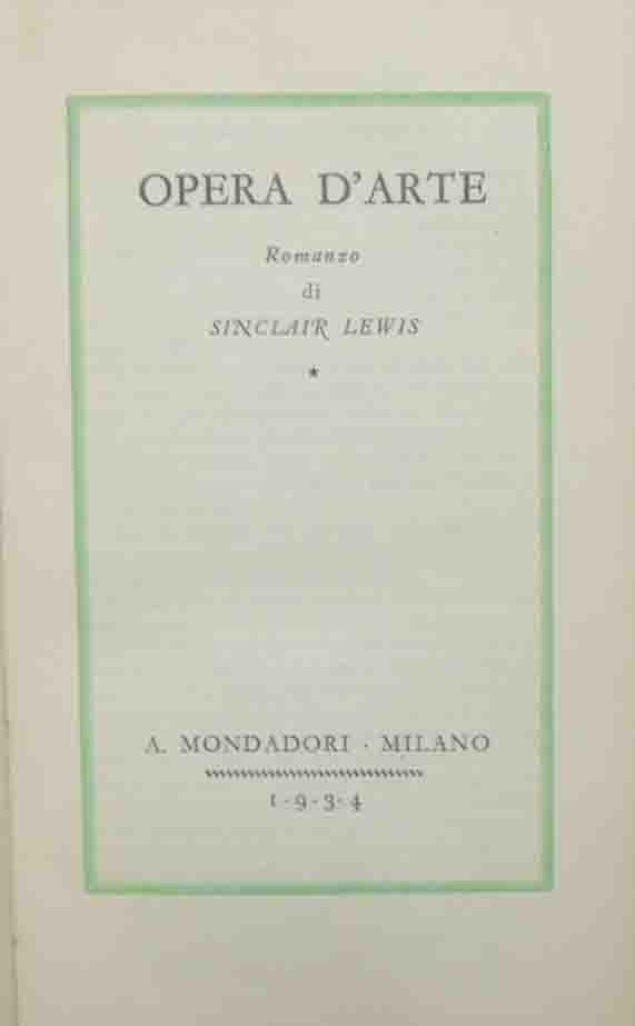 Opera d’arte. Romanzo di Sinclair Lewis, A. Mondadori, Milano 1934, pp. 462, cm 21, tela ed. con titoli in oro al dorso. Collana Medusa, n. 40. Titolo originale: Work of art. Traduzione di Mario Borsa. Volume privo di sovraccoperta. Firma d’appartenenza alla prima pagina di guardia, minime tracce d’uso, carta uniformemente ingiallita, per il resto buona copia.