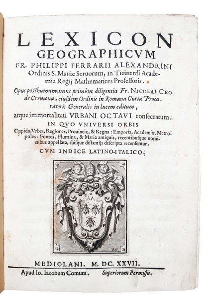 Lexicon geographicum fr. Philippi Ferrarii Alexandrini […] Opus posthumum, nunc primum diligentia fr. Nicolai Ceo de Cremona […] in lucem editum, atque immortalitati Urbani Octavi consecratum, in quo vniuersi orbis oppida, vrbes, regiones, prouinciae, & regna: emporia, academiae, metropoles: fontes, flumina, & maria antiquis, recentibusque nominibus appellata, suisque distantijs descripta recensentur. Cum indice latino-italico.