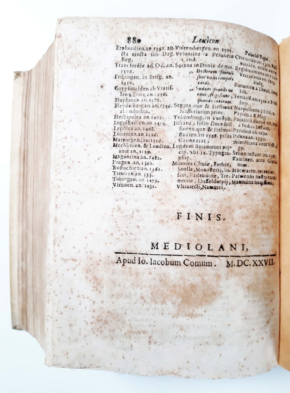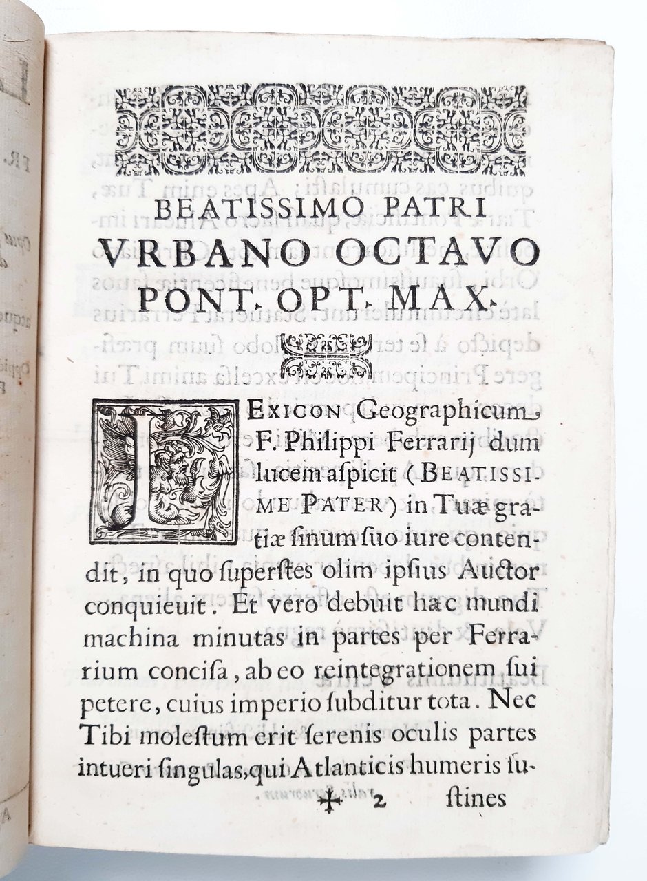 in-4°, 210x152 mm, leg. in piena pergamena rigida, con titolo (sbiadito) manoscritto al dorso; pp. [156], 880. Stemma calcografico di papa Urbano VIII. sul frontespizio. Iniziali e fregi xilografici. Edizione originale di questa vasto dizionario storico-geografico a cura di Filippo Ferrari, opera pubblicata postuma in due versioni nello stesso anno e dallo stesso editore (Giovanni Giacomo Comi): questa ed una senza stemma e dedica a Urbano VIII (con due pagine iniziali in meno, IT\ICCU\PUVE\000193). Succesivamente questa celebre opera fu stampata e ripubblicata diverse volte nel XVII secolo. Filippo Ferrari (1551-1626), sacerdote e insegnante, è stato uno dei più benemeriti cultori delle scienze ausiliarie della storia: la topografia, la geografia, la cronologia ed affini. In particolare quest'opera, il Lexicon geographicum, fu pubblicata postuma anche se era già pronta per la stampa al momento della morte dell'Autore (1626), che aveva già pubblicato un altro testo, meno importante, sempre di carattere storico-geografico: Epithome geographicum in quattuor libros divisum. (Pavia, A. Viani, 1605). Prov.: Iscrizione d'appartenenza manoscritta a penna alla prima guardia libera anteriore (Sac. Paolo Verzegnassi). Presenza di antiche annotazioni iscritte a penna su alcune pagine a margine del testo. Rif.: IT\ICCU\UM1E\022117. OCLC, 457919391. Cond.: Presenza di occasionali bruniture ad alcune carte. Esemplare molto buono.