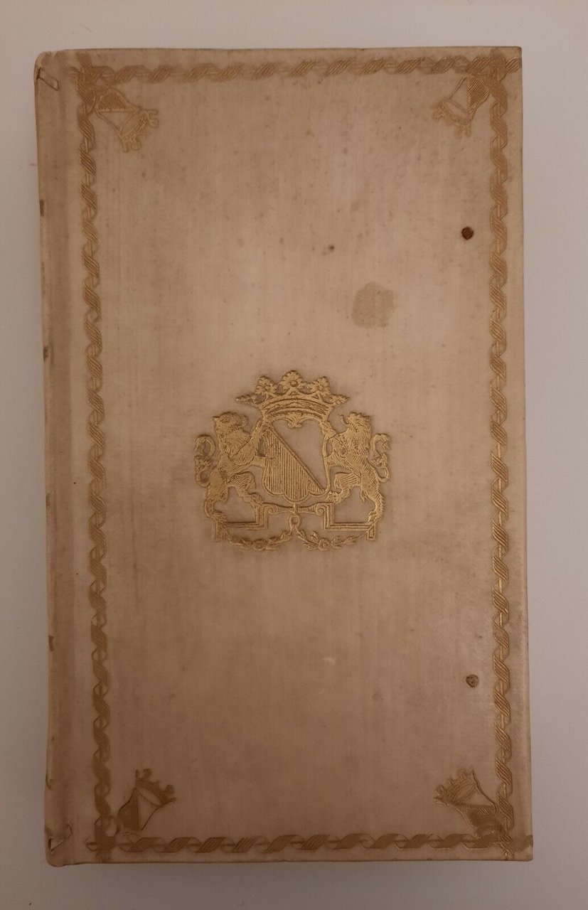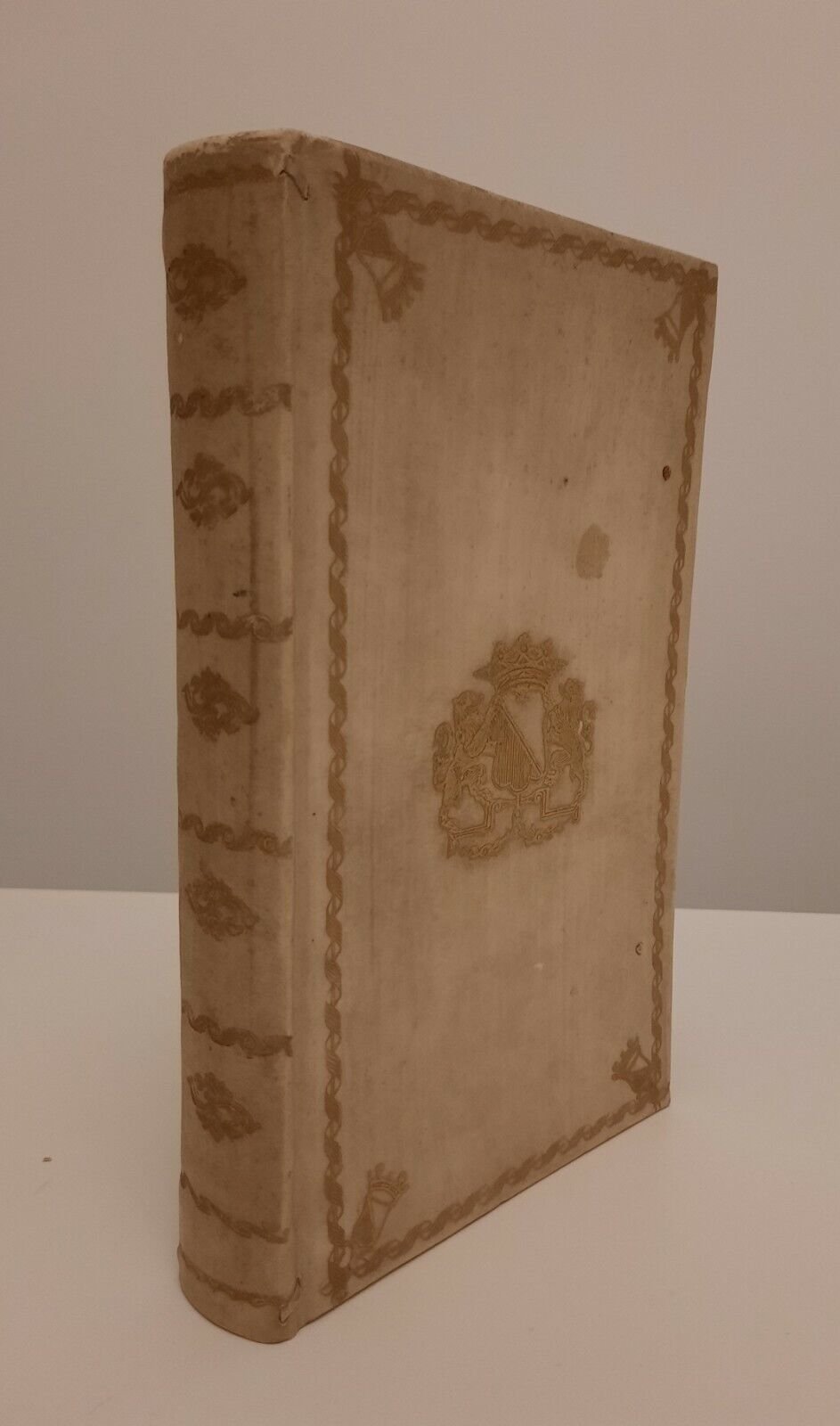 In 8°, pag. [4] 428 , legatura in piena pergamena con fregi e armi incise in oro.