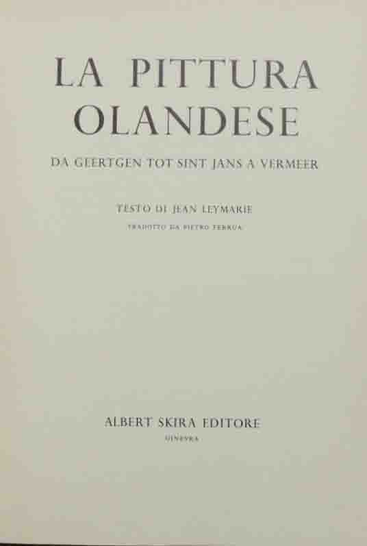 La pittura olandese. Da Geertgen Tot Sint Jans a Vermeer, testo di Jean Leymarie, tradotto da Pietro Ferrua, Albert Skira Editore, Ginevra 1961, pp. 217, ill. b.n. e col. con illustrazioni in carta applicate sia nel testo che a tutta pagina, cm 35, legatura in similpelle ed. con titoli in oro al dorso e sovraccoperta. Collana Pittura colore storia. Leggere tracce d’uso alla sovraccoperta, con un piccolo strappetto e due piccolissime mancanze al dorso, minima ingiallitura della carta, per il resto buona copia.