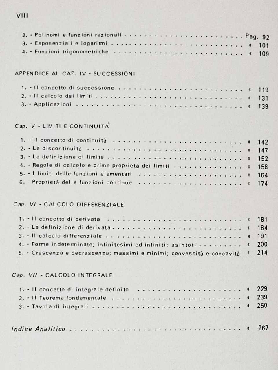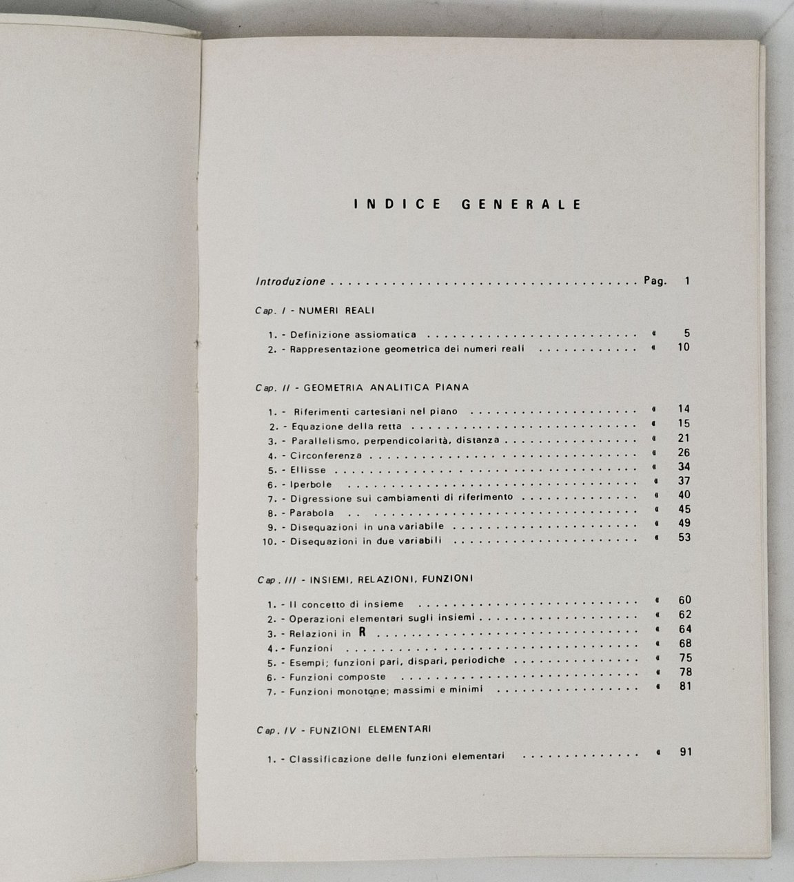 Finito di stampare nel novembre 1978. Pagine: VIII + 269. Formato: 17,5 x 25 cm circa. Una firma d'appartenenza a biro sulla prima pagina bianca, un minuscolo segno a penna su pagina 51 e una riga sottolineata a penna con segno a margine su pagina 234a ma, nel complesso, un esemplare decisamente ben conservato. Copertina editoriale flessibile. Indice dei grandi capitoli: Introduzione; I- Numeri reali; II- Geometria analitica piana; III- Insiemi, relazioni, funzioni; IV- Funzioni elementari; V- Limiti e continuità; VI- Calcolo differenziale; VII- Calcolo integrale.