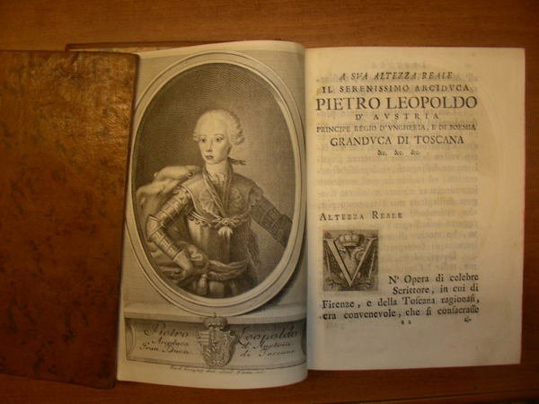 2 voll. in-8, pp. CXCV, (1), 296; (2), 299-718, leg. p. pelle coeva con tit. e fregi oro ai d. a 5 nervi. Tagli rossi. Risguardi in carta dec. Marca tipogr. in rame al front., con tit. a due colori. Capilett. e fregi xilogr. Con 15 tavv. f.t. compresi 2 ritr. dell’A. e di Pietro Leopoldo Granduca di Toscana cui è dedicata l’opera. Una tav. raffigura la pianta della città di Firenze com’era nel 1529. Moreni I, 496 la dichiara “divisa in tre parti”, mentr l’opera è completa in due. Gamba 2292: “Pregevole edizione. Sono XVIII lunghe e dotte lezioni”. Lozzi 5523. Graesse IV, 89. Cicognara 3149: “. opera dottissima.”. Picc. dif. alle cuffie inf. Belliss. e fresco esempl. a larghi margini in elegante legatura. 0152